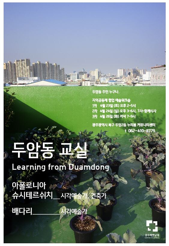 The curatorial team also contemplate the question “what does a Biennale do?” within a larger industrial ecology. On the opening day, a forum entitled “To All the Contributing Factors” gathers and salutes roughly 100 “small- and medium- scale” art organizations, or “fellows” from all over the world which GB11 considers are not sufficiently valued by the mainstream art world.2 GB11’s “local curatorial associate,” the artist cooperative Mite-Ugro, coordinates Monthly Gatherings at its project space inside the local Daein Market. Additionally, an Infra-School (consisting of lectures, presentations, discussions, and seminars by artists and curators) has toured Korean universities and art schools since the end of last year. This intricate constellation of programs and events can be regarded as the most insightful effort of GB11.