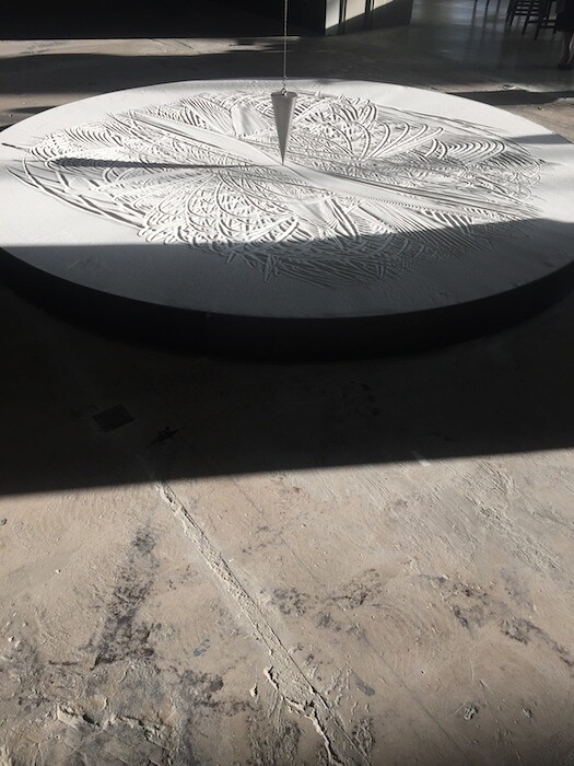 The Delhi-based trio Raqs Media Collective, comprising Jeebesh Bagchi, Monica Narula, and Shuddhabrata Sengupta, are pedagogues par excellence. Their artistic and curatorial practices perpetuate a core strategy of reckoning and, now, coping: to stay inquisitive yet “to look beyond answers.” So it is that speculative imagination and future-oriented utopianisms set the tone in the great hall, turning it into a planetarium of choreographed gestures and temporalities. At the center of the first floor, the dancers of Lee Mingwei’s Our Labyrinth (2015–ongoing) perform intermittent rituals of sweeping grains into patterns before gathering them back into a tight stack, each time imposing a unique, temporary magnetic field upon the space and its spectators; at Marjolijn Dijkman’s nearby Lunar Station (2015), a steel pendulum carves layering patterns on soft sand.