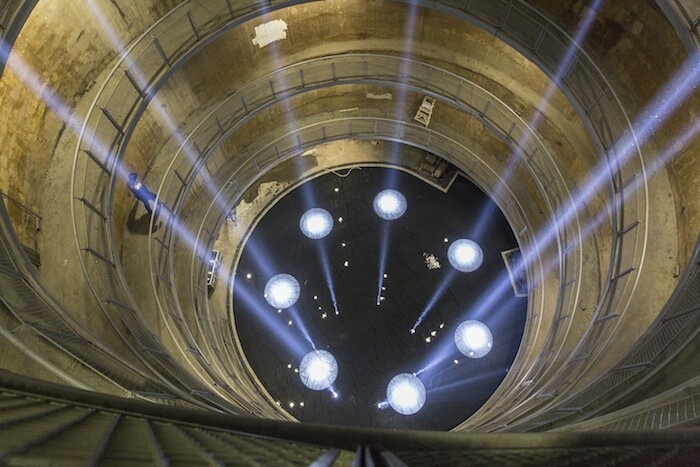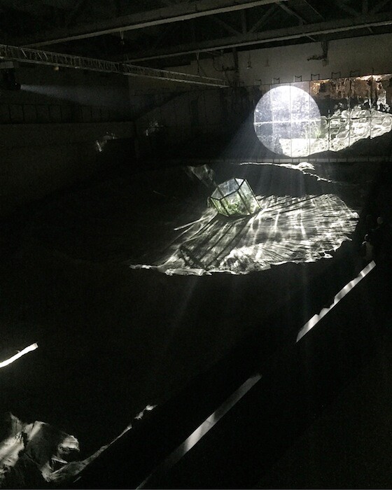 Forms and gestures are repeated and superimposed throughout the exhibition. The slow, long shots of assembly line workers with eerily fitting white masks in Yang Zhenzhong’s Disguise (2015) continue on various screens throughout the building, forcing the visitor to look again, and harder. Kendell Geers’s typographical interlacing of the Chinese characters for “revolution,” which form a glyph resembling the traditional pictogram of double happiness, magnifies an ironic and dissonant pleasure (PostPopRevolution, 2011). There’s also the architectonic sensation of tracing Liu Wei’s Panorama (2016)—a series of abstract structures that seem to constellate the ghosts of Vladimir Tatlin, Italian Futurism, and urban sculpture from 1990s China—up the grand stairs and towards the gargantuan installation built by Mou Sen and MSG, an experimental theater collective founded by Mou. Titled The Great Chain of Being—Planet Trilogy (2016), it is a “storytelling machine” about humanity’s dystopian turn: visitors enter through a crashed airplane broadcasting murky sound-bites of recent political regimes to explore the dark hearts of a strange (or estranged) planet of eschatological spectacles and post-human digital ruins. The theatrics are heavy-handed, with its crater, chasm, and a torchlight jerking menacingly above like the Eye of Sauron, but there’s some validity in the naturalism of this harrowing visualization, as dystopia manifests itself more and more readily in immediate realities.