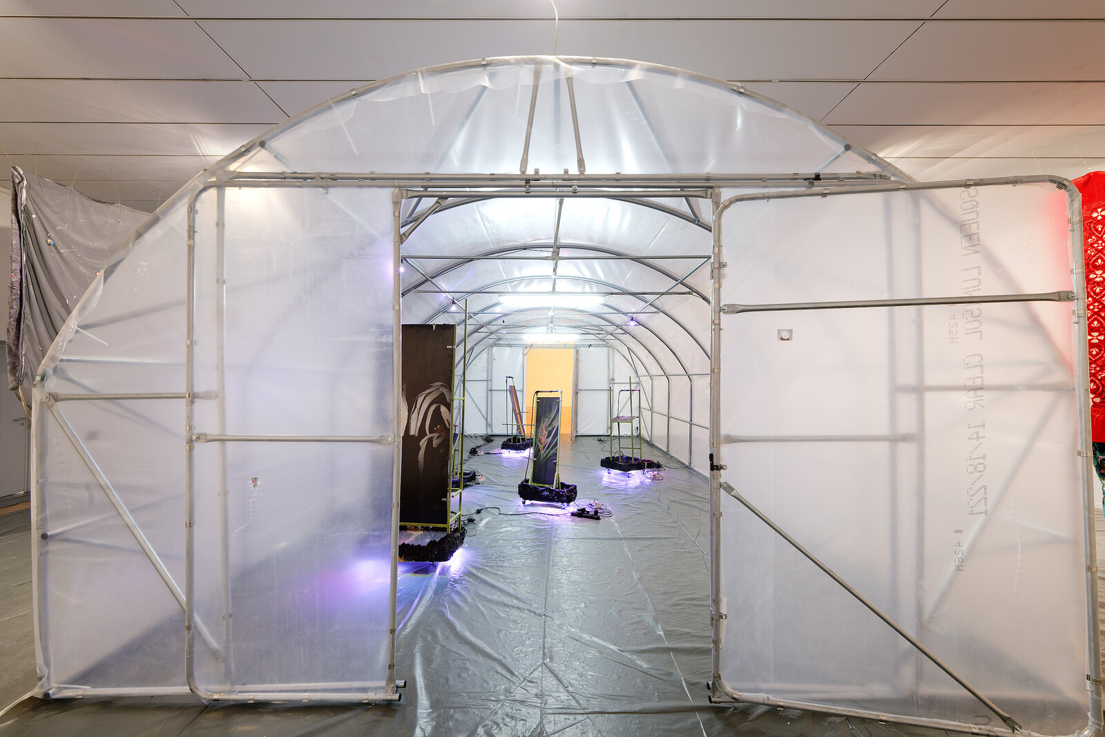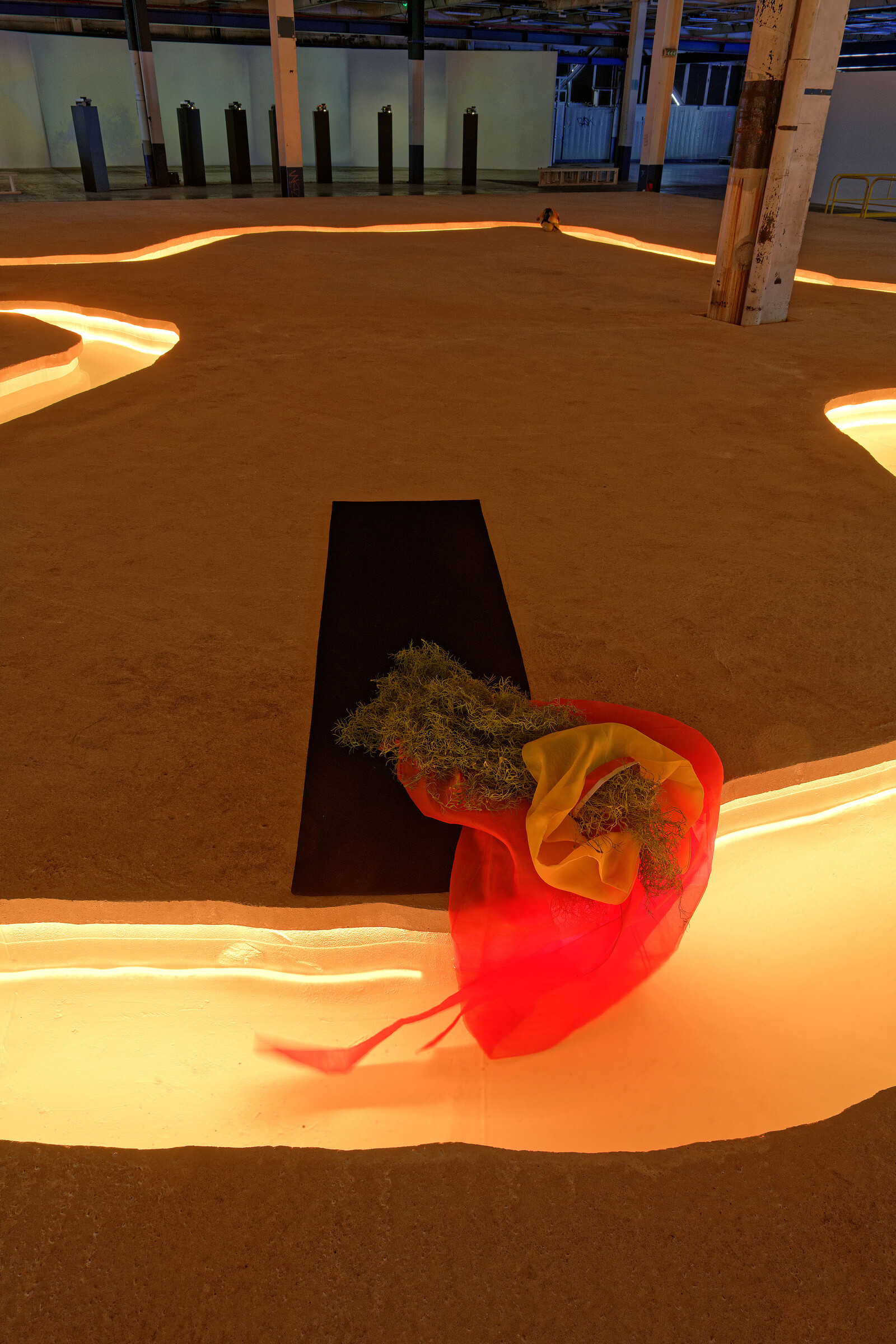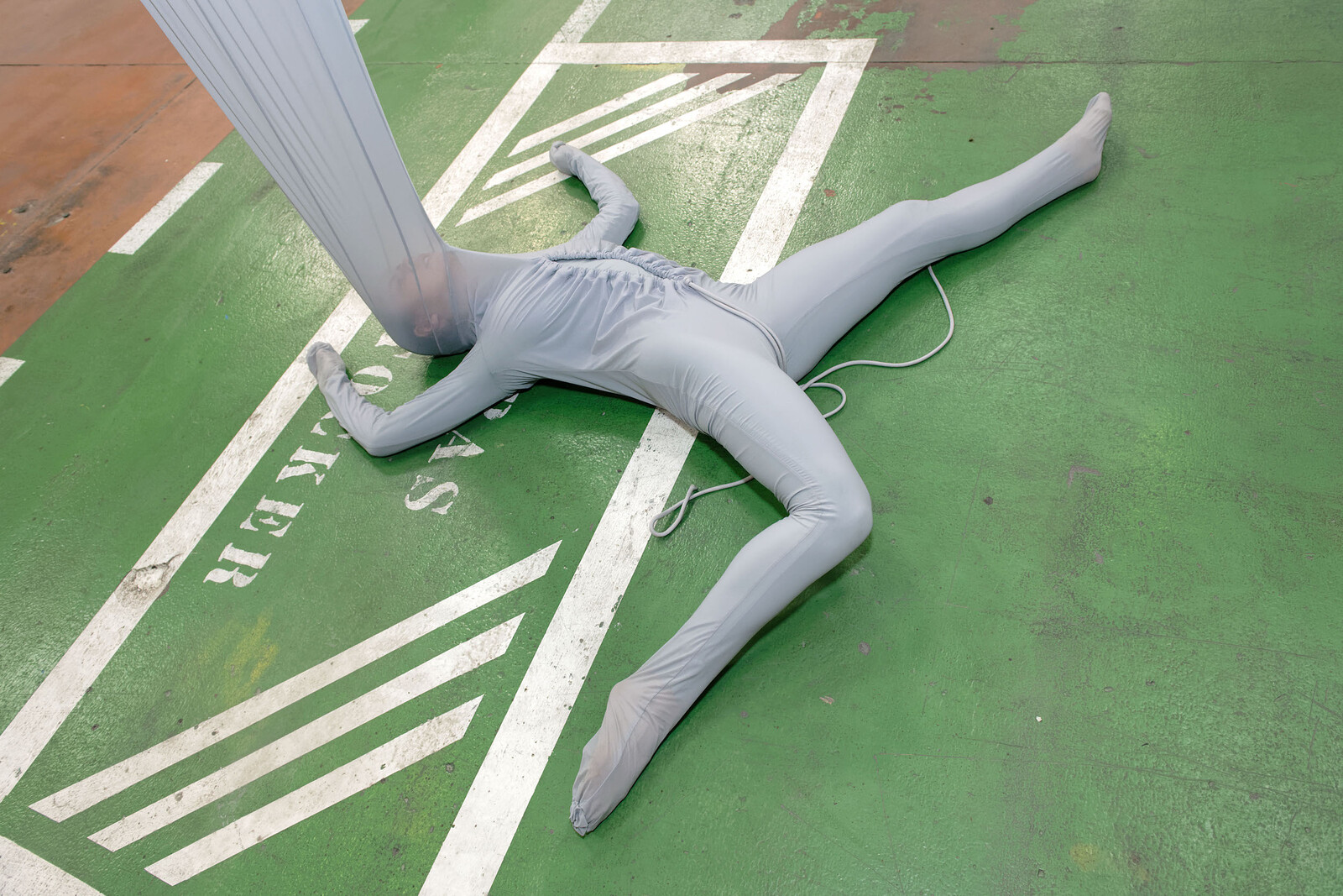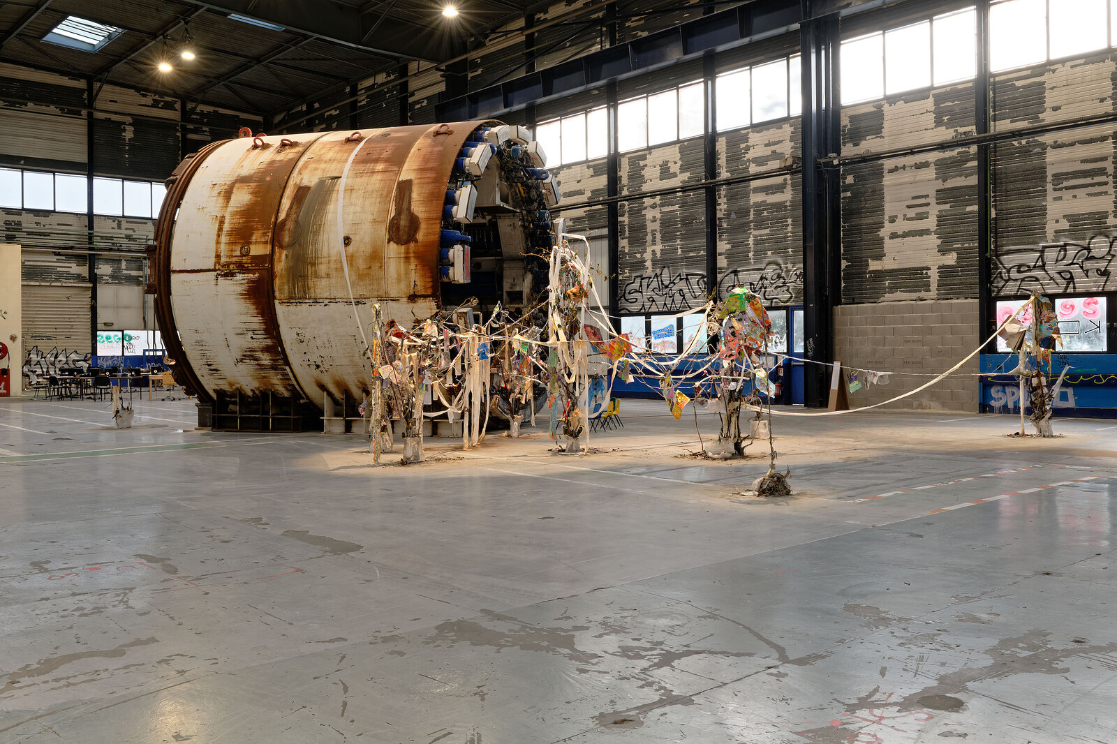 The postindustrial exhibition site is a cliché of contemporary biennales, but Lyon’s Fagor factory has an engaging history. Founded in 1956, Spanish appliance manufacturer Fagor was for decades the largest industrial worker-owned cooperative in the world. When the company acquired Brandt, the new French subsidiary Fagor Brandt commanded a significant chunk of the European domestic goods market. In the 1980s, almost 2000 people worked at the Lyon factory producing washing machines; by the 2000s, only 400 were employed there. After the 2008 crash, when many people could no longer afford to buy houses, they stopped purchasing home appliances too. An attempted conversion to producing electric cars failed, and the factory closed in 2015. Floor markings that once directed the choreography of the production line remain, as do a handful of windowed structures, from which processes or workers were observed, alongside redundant machinery, and graffiti from the building’s vacant years. Abandoned on site, an absurd 2007 limited-edition top-loading washing machine upholstered in pink satin, by lingerie designer Chantal Thomass, bears witness to Fagor Brandt’s death throes.