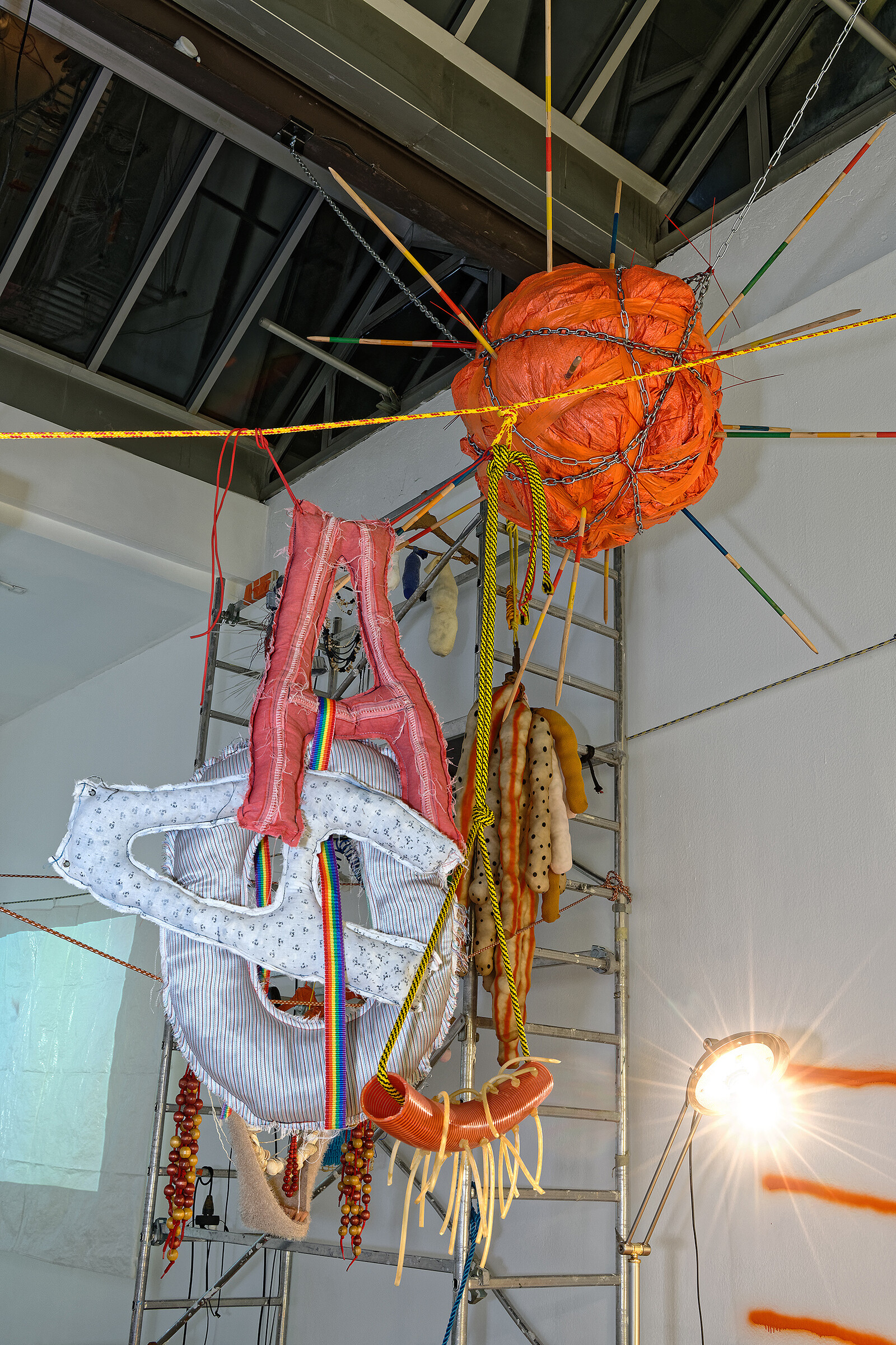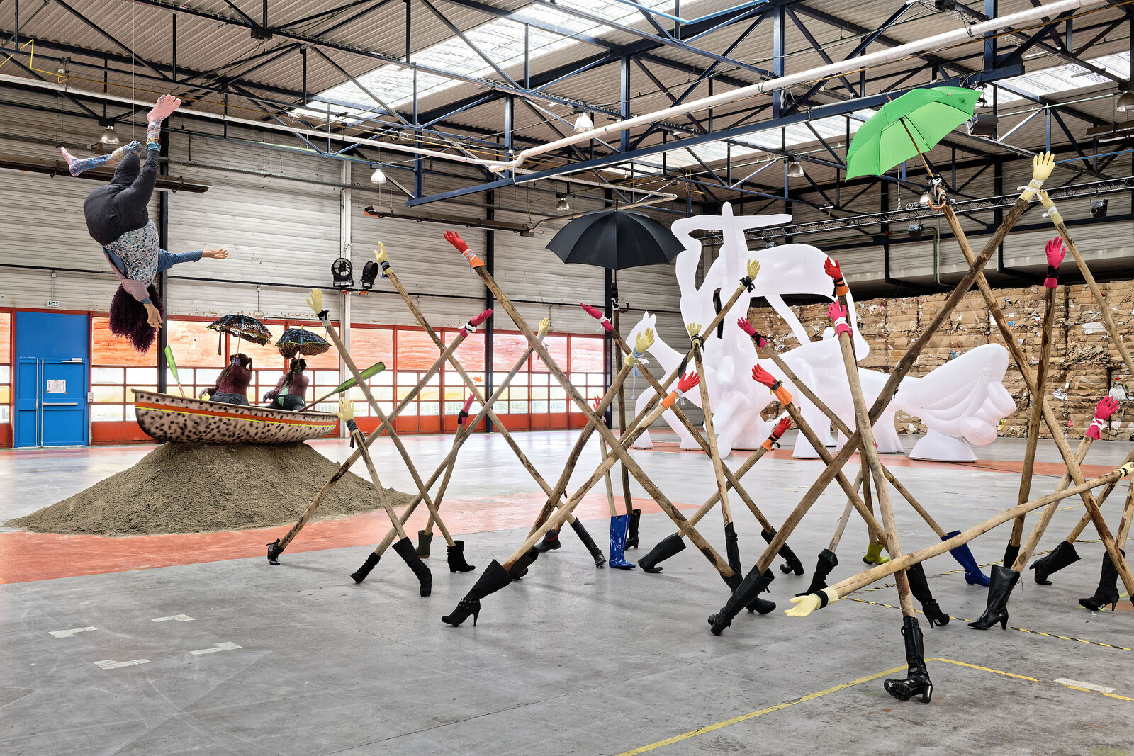 While the main venue is monolithic, an immovable monument to a former industrial era, the exhibition emphasizes flows with a title borrowed from a Raymond Carver poem. It’s apt for the city where the Rhône and Saône rivers meet and, more pressingly, for an exhibition populated by artists who envisage fluid meetings, intermingling, and hybridity. Works by 47 artists, most of them newly commissioned by the team of 7 curators from Paris’s Palais de Tokyo, sprawl over 4 echoing halls at the Fagor factory. The pieces fight to retain the viewers’ attention amid a near-total absence of exhibition architecture, resulting in a tangle of different textures. When dancers interact with the long gray lycra hangings attached to high ceiling lights in Malin Bülow’s installation Elastic Bonding (all works 2019 unless otherwise stated), they writhe unnervingly, as if rendered bestial through their communion with the building. Simphiwe Ndzube offers two contrasting caravans in transit through the exhibition: in In the Land of the Blind the One Eyed Man is King?, a clutch of downtrodden, wasted, and bulging figures lug burdens, their faces turned from viewers, while in Journey to Asazi, crossed sticks, booted and gloved, stride toward a rowing boat in which two figures bearing parasols are borne serenely away.