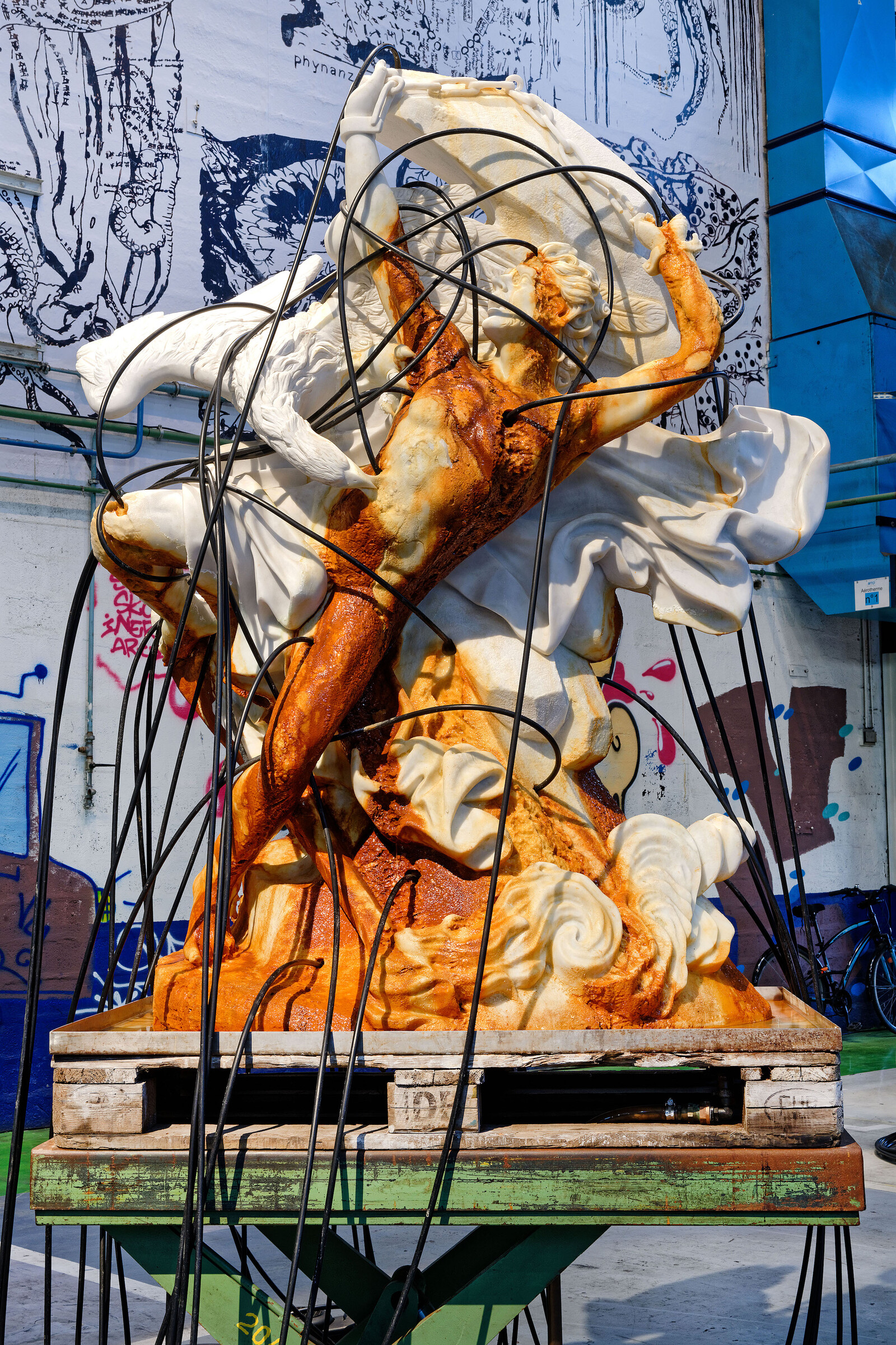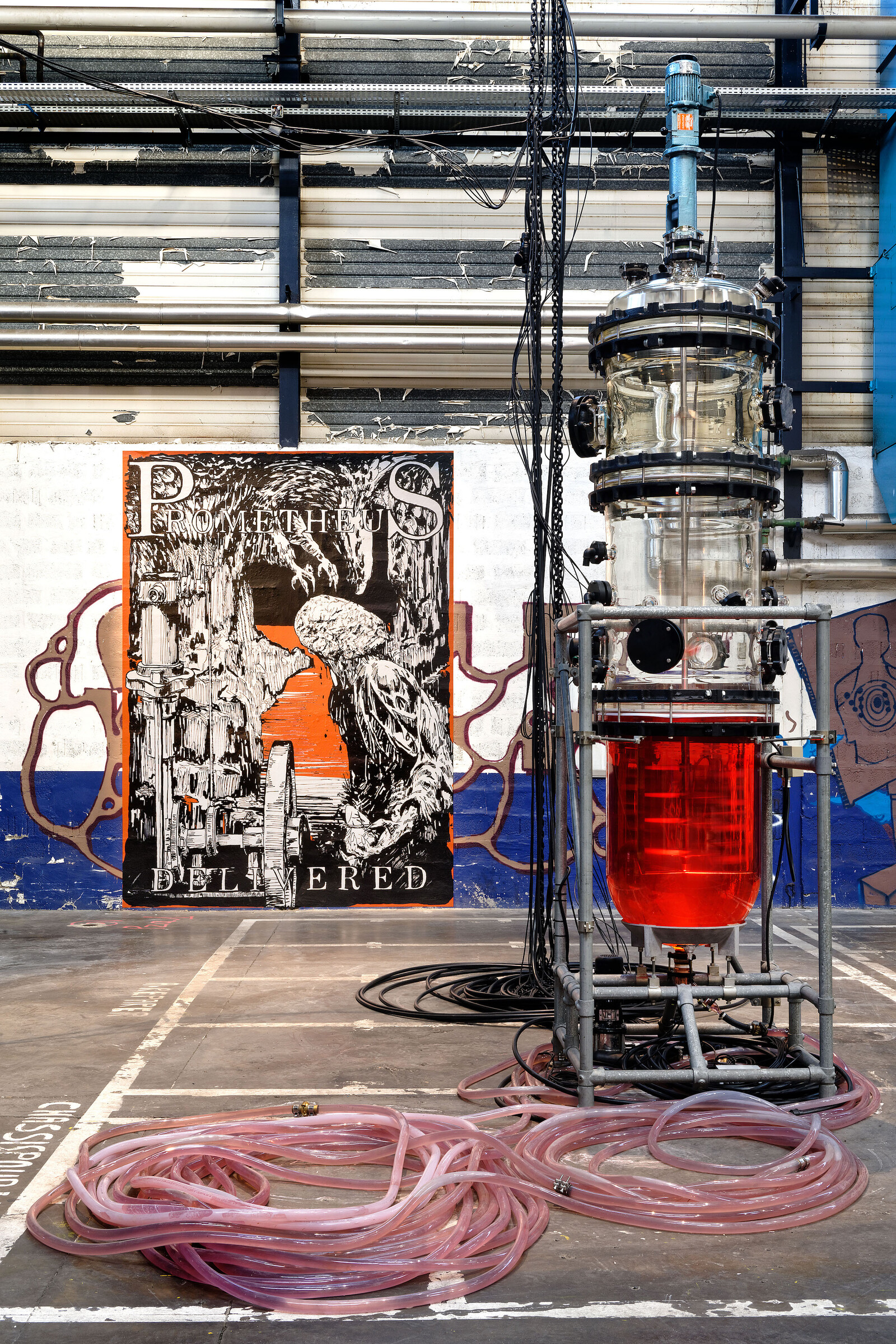 Evolution is embedded in the latest iteration of Thomas Feuerstein’s Prometheus Delivered (2017–19), an extensive laboratory in which the artist employs bacteria to dissolve a marble Prometheus and attempts to grow the eagle-pecked hero an ersatz liver from human cells which, when fermented and distilled, produce alcohol. There’s even the repulsive prospect of extending the cycle by drinking the spirit produced—it’s bottled and labeled Aithon, after the bird that tormented the Titan—to the detriment of one’s own organs. Feuerstein’s tangled machinery is nonetheless straightforward in comparison with Sam Keogh’s Knotworm. Alongside the mechanical might of the front of a tunnel-boring machine placed on the floor of the hall is a scrappy grove of trees fashioned from sticks planted in toilet bowls and hung with garlands of toilet paper and taped-on photocopies. A video playing on a monitor in the lap of the machine tells a tale that tunnels and spirals through the subsoil of West London, touching on Doris Lessing’s 1985 novel The Good Terrorist, owners of empty properties cementing toilets to discourage squatting, artists’ studios (a precursor to gentrification), Battersea Power Station, buddleia flowers, and rhizomatic knotweed burrowing under buildings. The solid stuff under our feet, the work suggests, is also in continual motion and rooted in a broader, messy, political context. Yet Keogh’s concentrated engagement with his locality casts a questionable light on the Fagor factory site and the curators’ strategy in using it: the biennial is cementing the location in a new leisure economy. Erstwhile graffiti artist Stephen Powers’s Open Door, a sanctioned, spray-painted message on the building exterior reading “WARM IN YOUR MEMORY,” gains traction from nostalgia—and will look good in the brochures.
