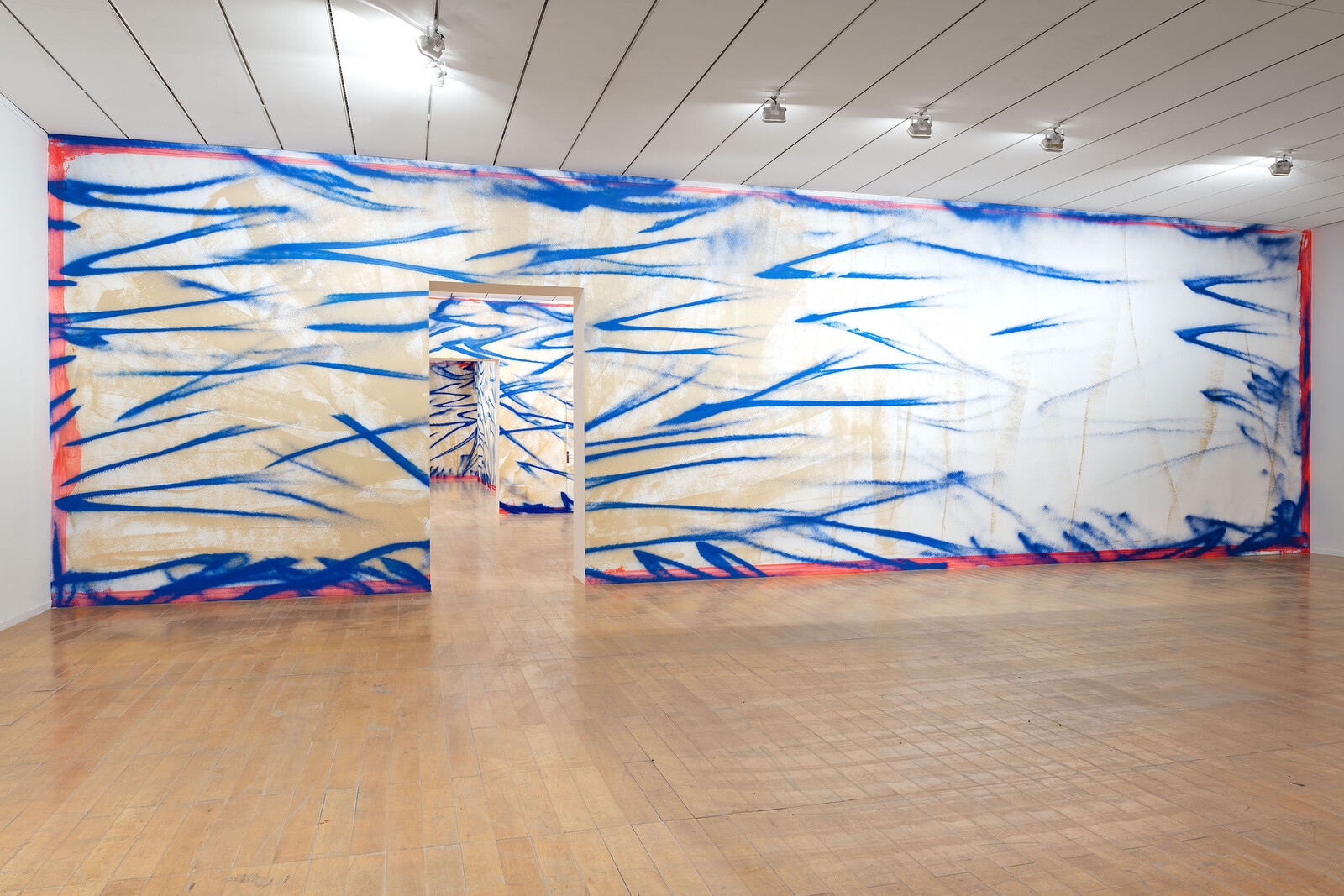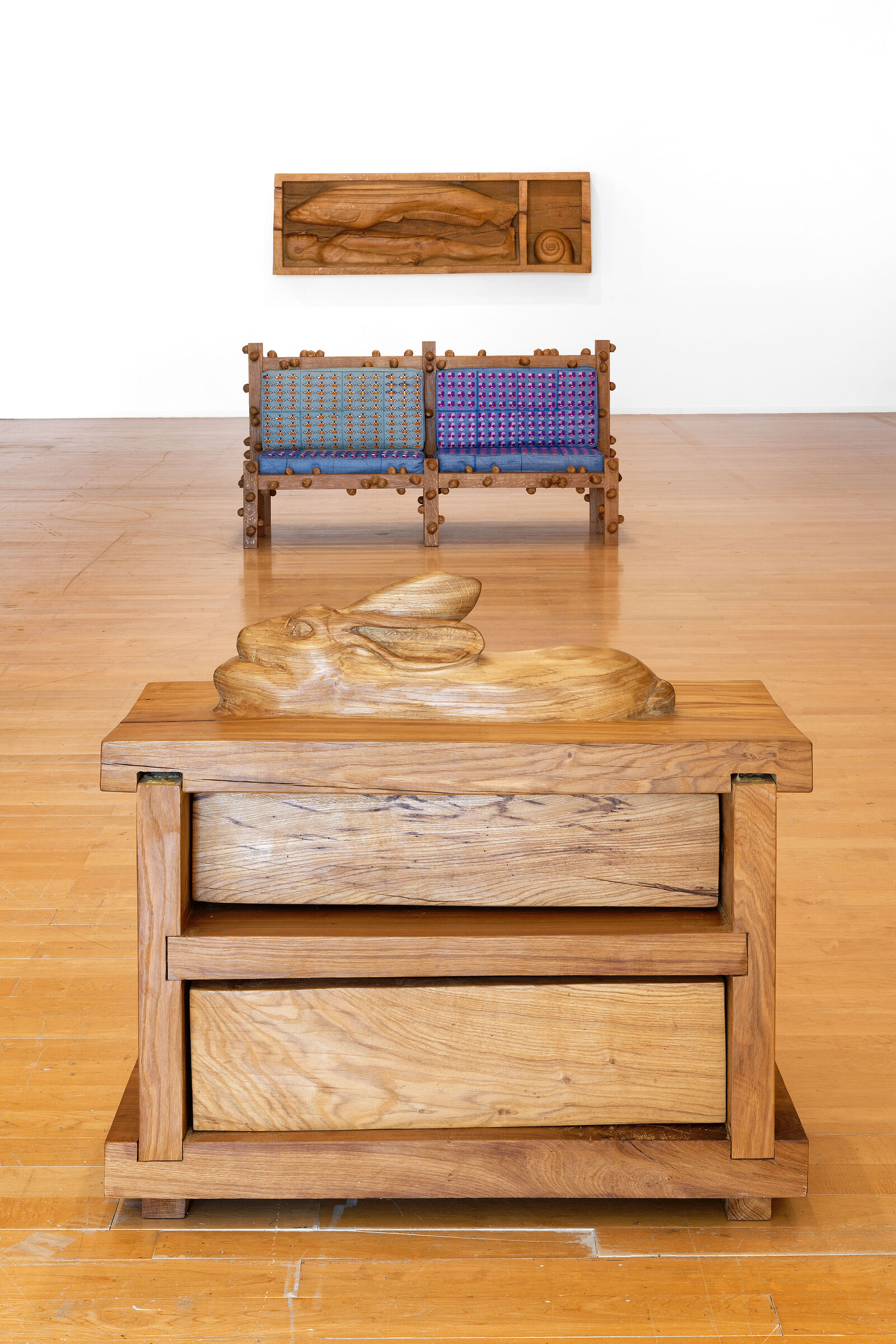 The other principal venue, the Musée d’Art Contemporain de Lyon, provides generous platforms for eight artists. There’s a delightful plunge into Renée Levi’s painted rooms, a sea of broad, rhythmic blue strokes over the walls and ceiling, or overwhelming, aggressive pinks: an exceptional (and, rare, primarily aesthetic) experience within the biennale. Daniel Dewar and Grégory Gicquel’s “Mammalian Fantasies” series (2017–19) comprises carved oak cabinets, seating, troughs, and wall reliefs in which humans, pigs, moths, oxen, inanimate objects, and other creatures come together, the pieces placed in stiff, vaguely ceremonial arrangements or hung like church-wall memorials. The reconfigured mammalian hierarchies, which occupy two full floors, scarcely merit so much repetition. Gaëlle Choisne’s Temple of Love – Absence is more provisory, albeit delicately arranged, combining remnants, such as the exotic cigarette butts that dot the walls or the flotillas of fortune cookies on the floor, with larger elements, including fountains that pour water over digital images of plants. With a workshop feel, this space hums with possibilities, suggesting an environment in transition, being redefined, entrenched in inherited systems of consumption or governance yet carving out new room for maneuver.
