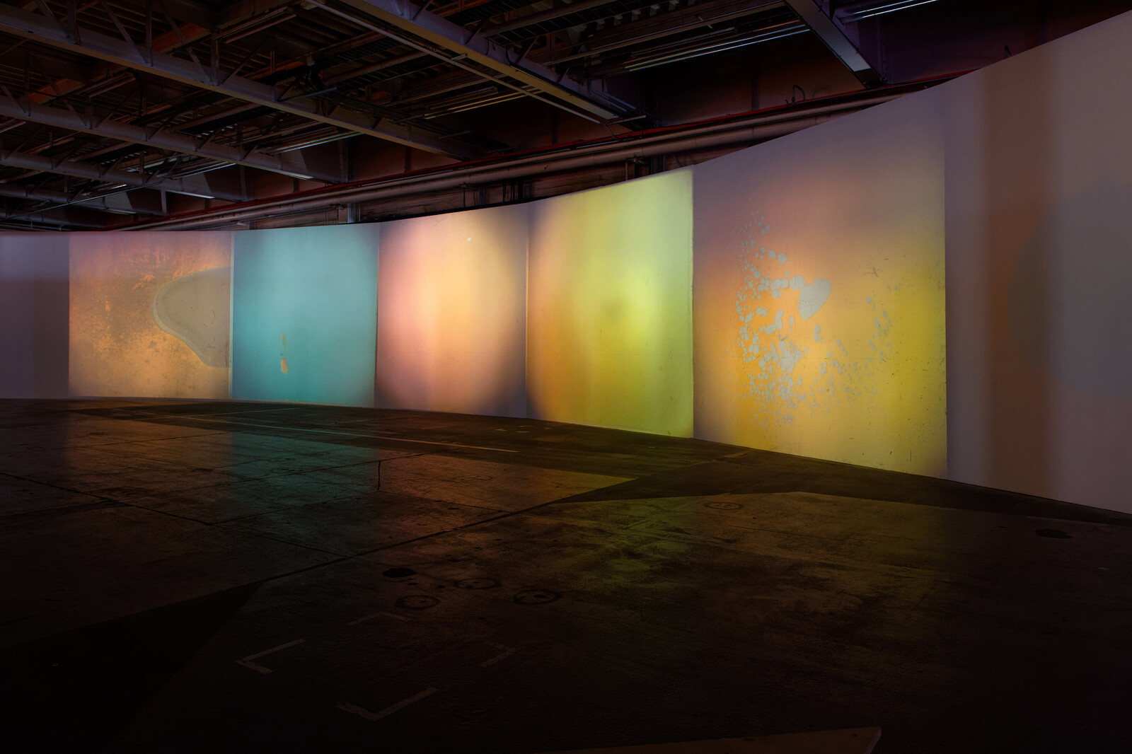 Minouk Lim’s Si tu me vois, je ne te vois pas [If you see me, I don’t see you] is positioned near the entrance of a low-lit hall. Chiming with the biennale title, the installation’s stream of hot, revolving water, set into a raised floor and illuminated yellow, is as natural as a spin cycle; kitsch though it is, a bobbing, oversized pinball and a trailing red garment based on a traditional Korean shroud together illustrate a heritage at the mercy of the vagaries of skittish times. Here too is Gustav Metzger’s Supportive (1966–2011), a trio of liquid crystal projections that continually morph in response to the projectors’ heat, light, and movement.