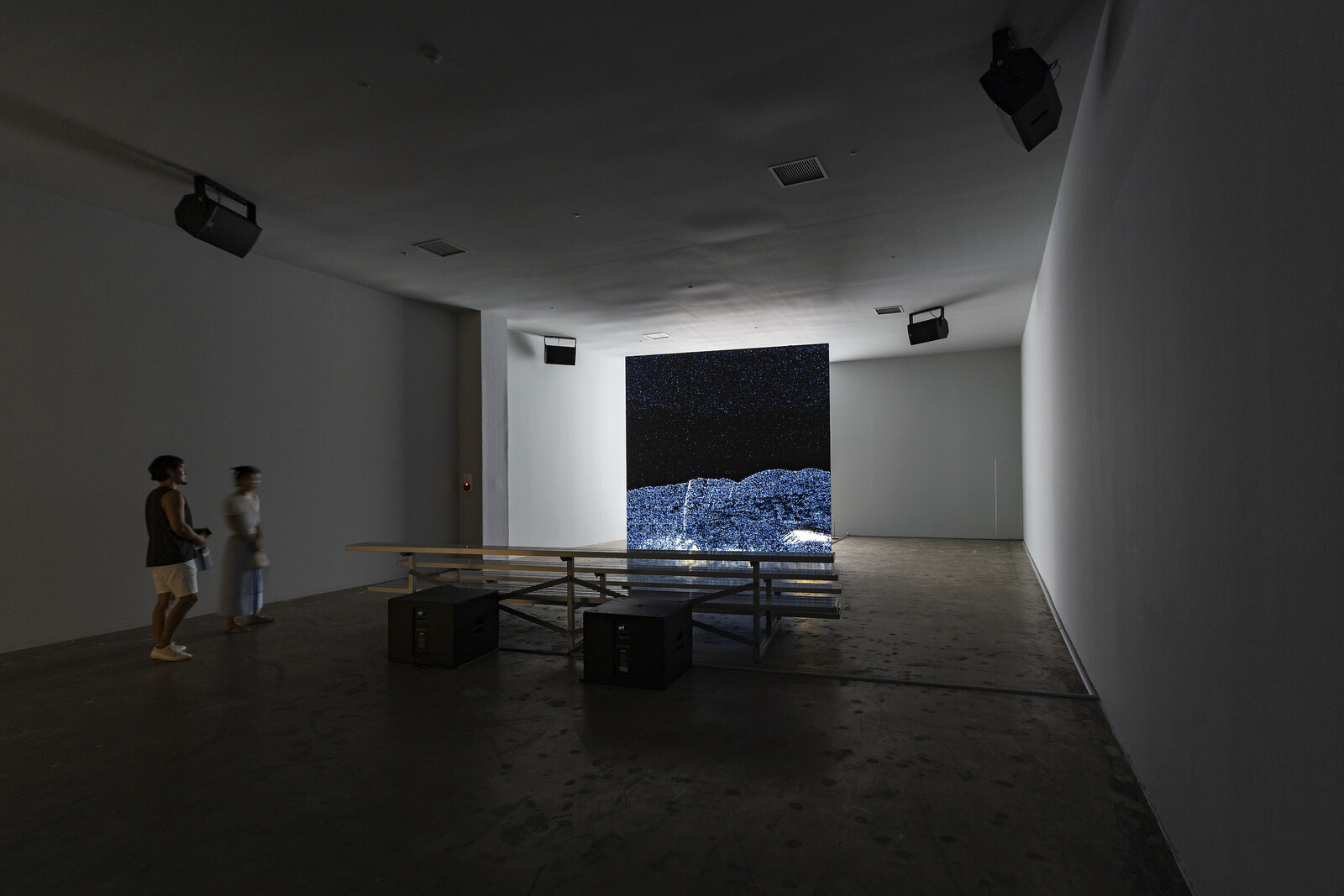 Their collective title, “The Blind Leading the Blind,” neatly captures the impression that visitors to an exhibition curated by Nicolas Bourriaud with Sophia Park, Kuralai Abdukhalikova, and Barbara Lagié will be forced to stumble around in the dark for meaning. This invitation to embrace uncertainty and engage different modes of perception (as the title suggests, there is a strong emphasis on sound) feels apt to the historical moment, and put me in mind of Marianne Moore’s proposal in “Poetry” that readers losing their faith in literature might move through texts like a “bat, / holding on upside down or in quest of something to / eat.”3 On the flipside, it also hints that the biennale as a whole might not have any clear sense either of where it is going or how it might get there.