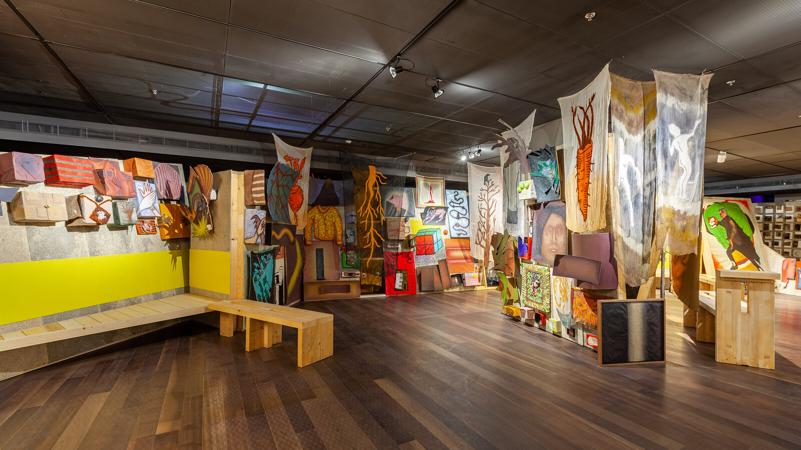 Back at the Museum of Painting and Sculpture, visitors are welcomed by Worlbmon (2019), an installation by duo Güneş Terkol and Güçlü Öztekin that hovers above the exhibition’s three venues. Composed of large-scale paintings and drawings, colorful flags, curtains, plywood benches, and other structures, Worlbmon dilutes the dichotomies that the exhibition seeks to complicate—culture and nature, evil and good, old and new, reality and fiction—into one another. The space it creates becomes a decentered ecosystem that allows for incompletion and fragmentation without attempting to impose categorical identities upon viewers. One reading of it is that it offers an opportunity for viewers to come together with their companions, offering a space in which to build inclusive micro-communities. This biennial, which begins with distressed representations of the world, ends with a soothing feeling.