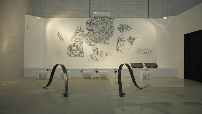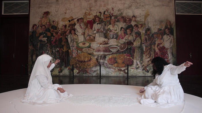 Many of the works in the museums surrounding Fatahillah Square (the Jakarta History Museum and the Museum of Fine Arts and Ceramics) specifically tackled colonialism: Mathieu Kleyebe Abonnenc’s video Sector IX B, Sleeping Sickness Prophylaxis (2015) concerns a French delegation sent to Senegal in the 1930s to make a cultural map of the country. The objects they amassed become the source of a psychedelic narration in Abonnenc’s work, which takes place mainly in the IFAN Museum of African Arts in Dakar and the Musée de l’Homme in Paris, in search of the memory they hold. The Indonesian artist Ratu Rizkitasari Saraswati, in the performance Meronce (Beading, 2017), threaded string through small glass beads, accompanied by her mother or sister, in a ritualistic re-staging of an activity often performed as a learning tool by schoolchildren in the country. The performance was significant for its content as well its context: the room around the two figures is decorated with a partially completed, thoroughly insipid mural showing Dutch colonialists eating satay; it was reportedly left unfinished when the Dutch realized the humidity would inevitably cause the mural to decay. The Cameroonian artist Em’kal Eyongakpa turned to the prisons in the caves under the History Museum with the sound piece Untitled thirty-seven (sǒ bàtú) (2017), comprised of heartbeats and excerpts from black liberation figures such as Amílcar Cabral, Chinua Achebe, and Haile Gerima.