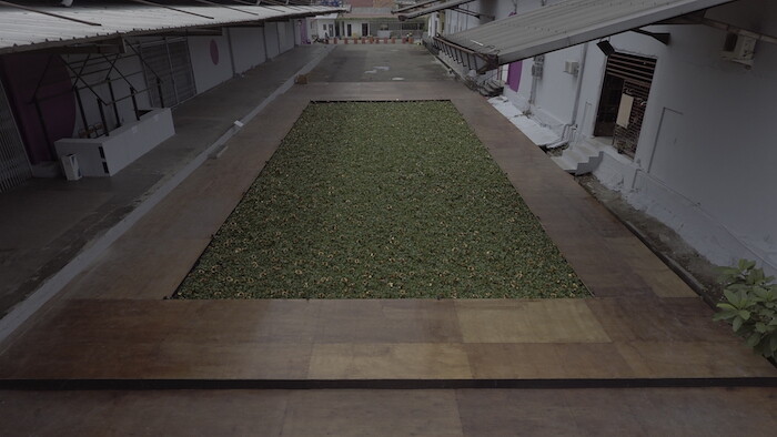 Jiwa thus activates a particular social and political background, which the exhibition grounds further with a historical focus. The show’s artistic director, Melati Suryodarmo, and her team Annissa Gultom, Hendro Wiyanto, Philippe Pirotte, and Vít Havránek, returned to the Indonesian generation that emerged in the mid-1970s. This was the moment when a group of artists in Jakarta rebelled against the academicism of the Second Jakarta Painting Biennale of 1974 and instead linked themselves with anti-Suharto activism. For Eceng Gondok Berbungan Emas (Water Hyacinth with a Golden Rose, 1979/2017), Siti Adiyati, for instance, made an artificial pond in the wide gulley between the main venue’s two warehouse spaces. Water itself is barely to be seen. so carpeted is the pond with bright green hyacinths, out of whose dense network metallic roses crane upwards—or, rather, cheap plastic roses that she has spray-painted gold. It’s beautiful, both in itself and as a canny staging of platitudes of beauty. The work recreates a 1979 piece that used its looks as critique: in the late 1970s General Suharto announced an environmental improvement policy of making Indonesia “green,” but the introduction of a water hyacinth only served to choke the rivers and undermine native plant species. The biennial’s second iteration of this work is both an homage to a persistent spirit of activism in Indonesian art, and an attempt to bring back certain figures into the history of Southeast Asian art, where they are at risk of being forgotten.