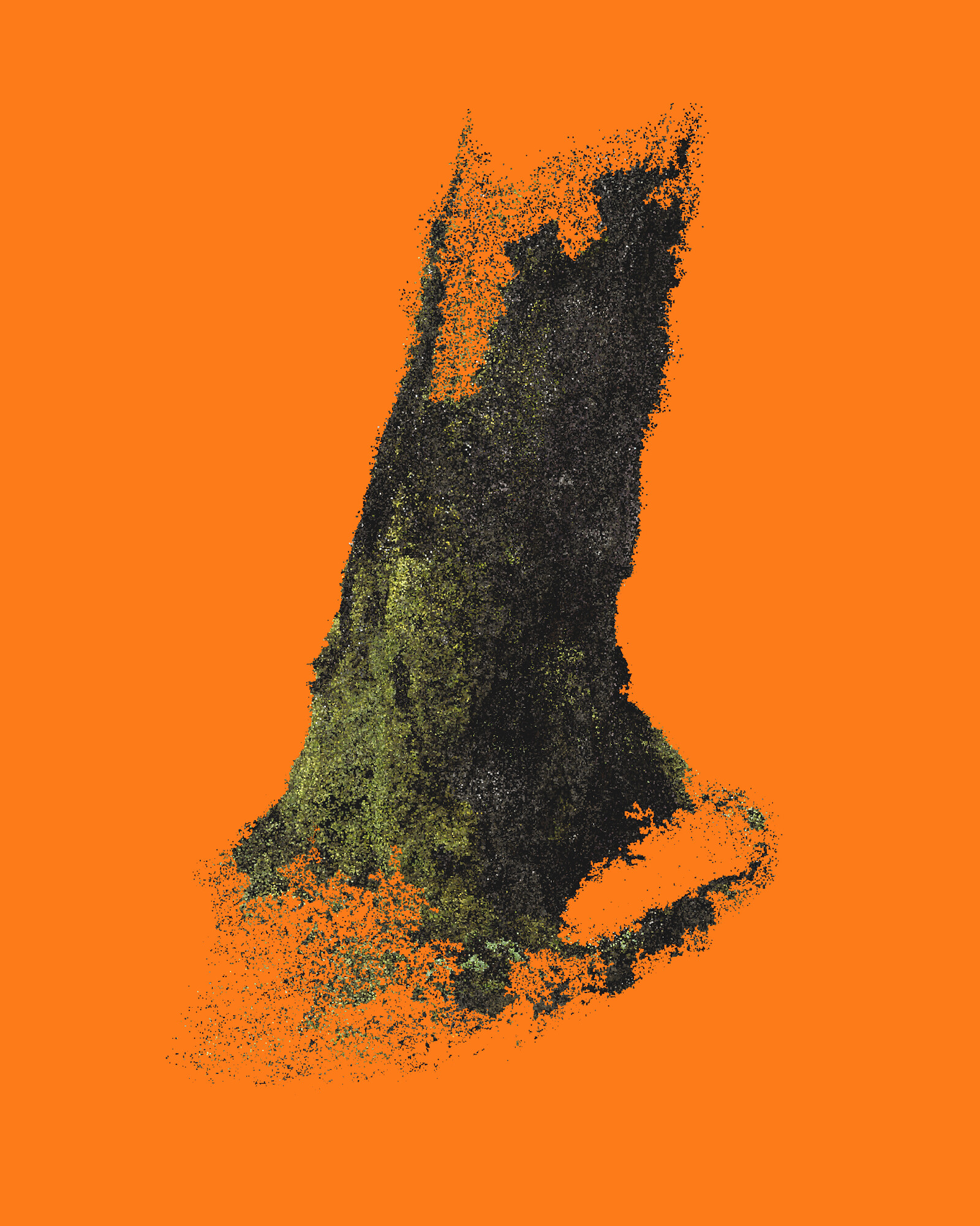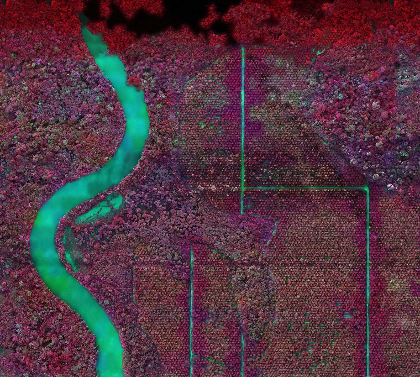 There “Into the Woods,” curated by Sophie Haslinger—one of many programmed or affiliated exhibitions and projects—arranges works by nineteen artists into thematic areas that cover, amongst others, the effects of monoculture, felling and deforestation, and how climate change is impacting forests in a survey of an environment we depend upon yet routinely destroy. Richard Mosse’s multispectral drone-camera shots illustrate deforestation in pointed pinks; Susanne Kriemann’s screenprints reflect on the poetry and exploitation of woods in ink generated from discarded cheap timber furniture; Eline Benjaminsen and Elias Kimaiyo follow the trail of carbon offsetting to land evictions in Kenya in order that trees can be planted for consumers elsewhere (and intrinsic knowledge of the place and its native fauna lost). Information on all of the works is supplemented by cautious scientific crib notes to each chapter authored by local academics. Alongside Diana Scherer’s root tapestries, for example, a text notes how the hypothesis that large trees supply smaller ones with resources through mycorrhizal networks “has so far held up in only a few scientific studies.” This might be edgy scientific language but is low impact for viewers accustomed to artistic speculation.