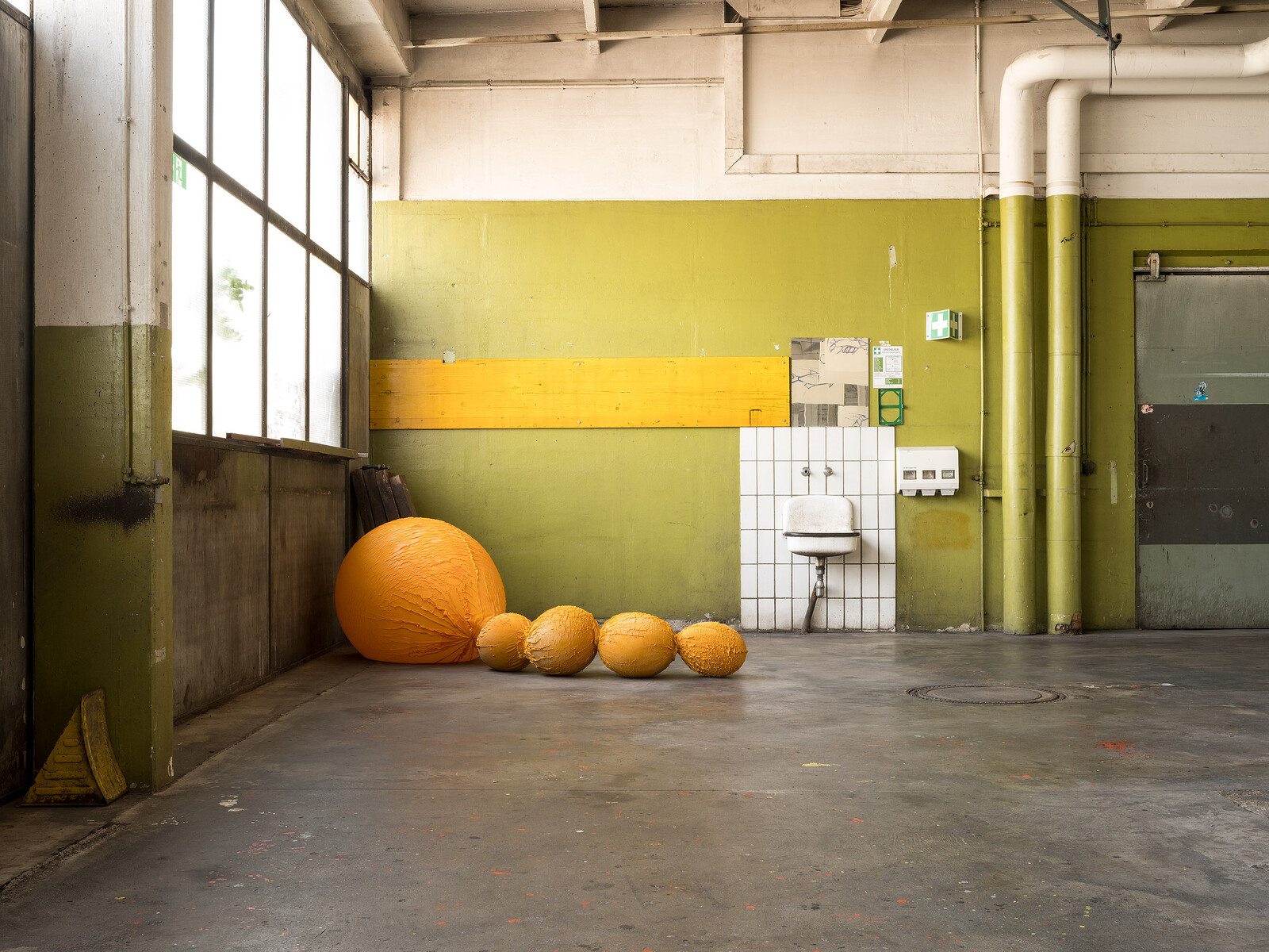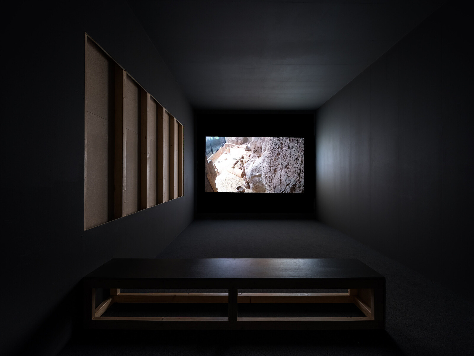 The second biennial focal point, a former railway site, Festivalareal Nordwestbahnhof, hosts the exhibition “Songs for the Changing Seasons” curated by Filipa Ramos and Lucia Pietroiusti. Works spread their wings in a long, postindustrial space: Eva Fàbregas’s Exudates (2024), large pinkish spheres coated in wrinkled and fleshy latex, might have emerged organically throughout the hall; Cooking Sections’ Salmon: Feed Chains (2022), a long trumpet-like rotating speaker, invites you to walk in circles while listening to the mesmeric yet horrific realities of intensive fish farming: “Fish eat chicken eat fish eat chicken feed feed feed….” Works bleed into each other audibly and visually in a disquieting chorus, so the silence of Adrián Villar Rojas’s The End of Imagination (2021) is striking: webcam footage of animals in sites deserted by recent lockdowns shows them manifestly unperturbed by our absence.