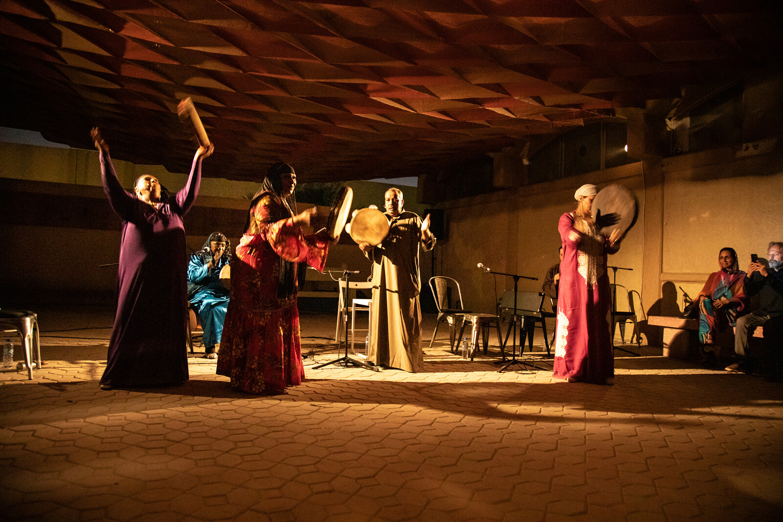 The triennial’s goals are ambitious, and some of the presentations are uneven. As always with periodic exhibitions, one wonders how much will be left for local residents once the front-loaded first days of performances and talks are gone; one queries the sustainability of the ecologically-concerned event, for which many participants and visitors fly in, and laments the opacity of some of the exhibited research presentations. There were stirring moments, but jarring ones too: the Ngurrara canvas ceremony felt particularly uncomfortable to watch, given the long history of white people, such as myself, peering at indigenous performances. The capacity of this event to effectively transplant anthropological research modes into a performance-based setting in a triennial hinged to an extent on what defines “us” and “them,” a question that has particular valences in the UAE context. The triennial was founded by Sheikh Khalid Al Qasimi, who died unexpectedly this July. His twin sister, Hoor Al Qasimi, who founded the Sharjah Art Foundation, took over to see this edition through. Though this event remains separate from the Art Foundation and its biennial, the Sharjah Architecture Triennial, along with the Africa Institute, now forms part of a nexus of Sharjah institutions conversant in critical theory and acting within the contemporary art field. These institutions have positioned themselves within the context of the Global South, participating in recent curatorial and scholarly interest in 1970s liberation and anti-colonialist movements, and giving the first serious exhibition platforms and commissions to many artists of the MENASA region. This track record, and the emirate’s extensive demographics, gives Sharjah’s institutions a sense of solidarity, and even of mission, with other parts of the Global South. This solidarity has meant greater representation for many regions in an art context, but the transition here into living rites and, to a lesser extent, policy strategies brought to the fore questions of who gets to speak for whom, and for what audience.