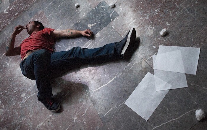 Shahryar Nashat’s video Parade (2014)— which observes a full spectrum of movement, bringing the conditions of production (rehearsal) and commodification (marketing) into its frame—is a brilliant derivation from choreographer Adam Linder’s interpretation of Jean Cocteau’s Parade (1917), composed for Sergei Diaghilev’s Ballets Russes. His video shares with Camille Henrot’s bronzes (e.g. Retreat from Investment, 2015), Alexis Teplin’s Arch (The Politics of Fragmentation) (2016), and Justene Williams’ reworking of Futurist opera Victory Over The Sun, a fascination with an early twentieth-century European moment.