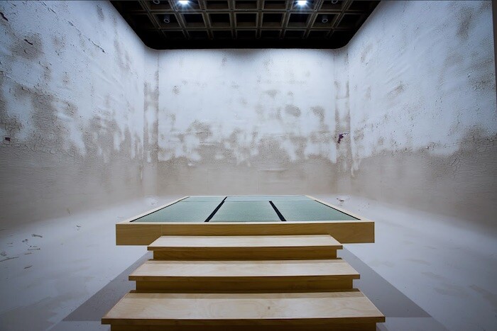 At the Embassy of the Real on Cockatoo Island, old media provide compelling figures of the saturation of our contemporary reality by information and imagery, in Maaike Schoorel’s subtle, barely figurative oils (as in Diver, 2015), that seem to find site-related imagery (indexed by a table of online research printouts) in the decaying walls of the rooms they were painted for, and Emma McNally’s large graphite drawings (the series “Choral Fields,” 2014-16) that create complex, brooding charts out of reference-less marks. Among the digital work, Cécile B. Evans’ witty faux-VR Preamble to a Prequel (of sorts), 2016, finds a somber rhyme in the actual VR headsets of A Walk in Fukushima (2016). The work allows visitors to the Embassy of Disappearance, at Carriageworks, to view the exhibition “Don’t Follow The Wind” (2015–) made within the Fukushima exclusion zone by the Japanese artistic collective Chim↑Pom.