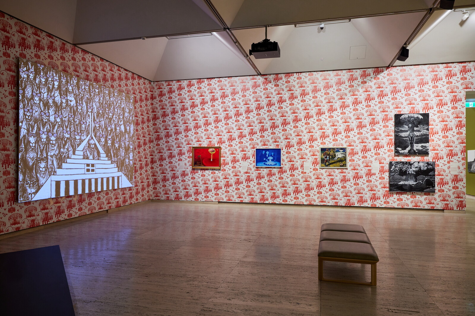 While distinct themes emerge at certain venues, curators Cosmin Costinaș and Inti Guerrero tend not to spell these out in thesis-driven wall texts, but let the artworks make the arguments. One room at the Art Gallery of New South Wales addresses the atomic bomb. Breda Lynch’s Cake Bomb (2016–21), an oil on Masonite reproduction of a notorious Life magazine photograph showing U.S. Navy Admiral William H.P. Blandy and his wife slicing a mushroom cloud cake after the Operation Crossroads tests at Bikini Atoll in 1946, is hung on Saule Dyussenbina’s wallpaper Achievements of National Economy, Fountain of Friendship of Peoples of the USSR (Moscow, Russia) (2023). In it, the titular fountain in the Soviet capital mushrooms like an explosion, alluding to the deep-rooted anti-communism that fired the Cold War arms race. Nearby, Waanji artist Gordon Hookey’s animated video Terraist (2014) features an army of kangaroos protesting under a beaming sun, and likens the imperial doctrine of terra nullius to terrorism. The arrangement dissects the atomic, carbon, and colonial apocalypses that have come to define the modern Pacific, and to incite waves of solidarity across the region. As Kathy Jetn̄il-Kijiner, the Marshall Islands poet, writes, “we are nothing without our islands.”2