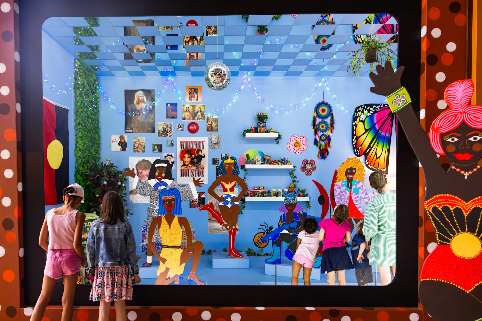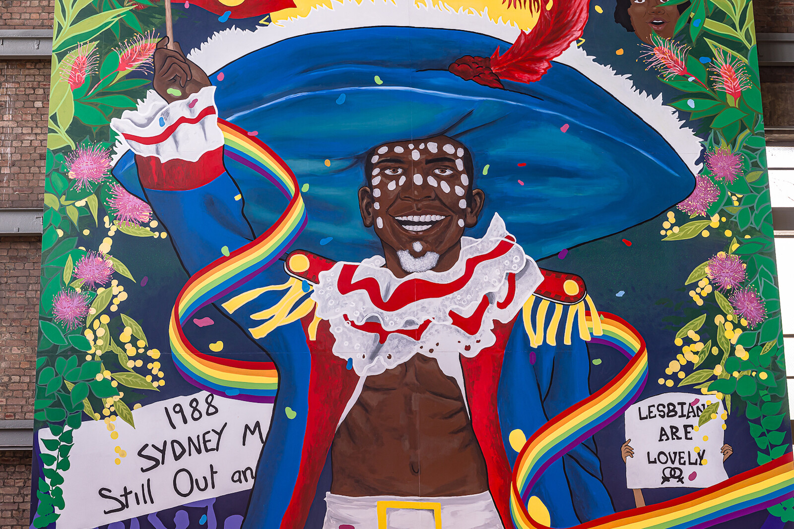 In 1988, during the nationwide bicentennial of the First Fleet’s landing on the Eora land that they named Sydney, Cole helped to design the first Aboriginal float at the city’s Gay and Lesbian Mardi Gras, in which he paraded in drag as British naval officer Captain Cook. Yuwi, Torres Strait, and South Sea Islander artist Dylan Mooney’s mural Malcolm Cole – larger than life (2024) at White Bay Power Station memorializes the jubilant dancer, his face painted with ochre, in a sassy, wide-brimmed Royal Navy hat, waving the Australian Aboriginal flag with its central golden sun.