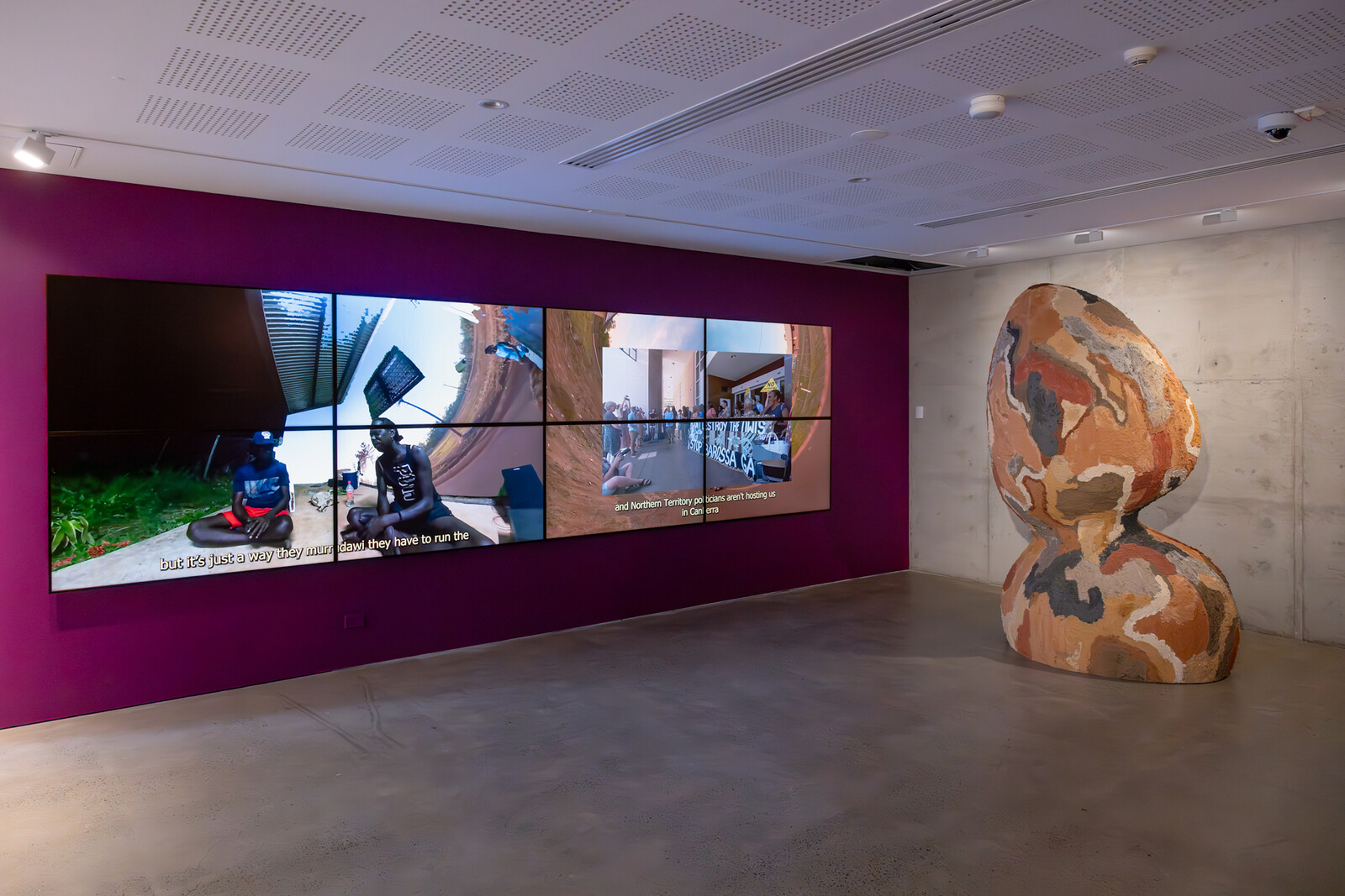 At UNSW Galleries, Yangamini’s mixed-media installation Mapurtiti Nonga (Evil Ass Dreaming) (2024) includes a video documenting the collective’s fight against the oil and gas company Santos’s Barossa pipeline in the Tiwi Islands, as well as three earthen butt plug sculptures. Symbolically, these sculptures are meant to plug the extraction of gases from the ground, and to stop the colonizers from speaking out their backsides, but of course they are also instruments of queer ecstasy. In this exhibition—one to cruise as well as to study—sobriety and joy are bedfellows. Even one sun can burn in ten thousand ways.