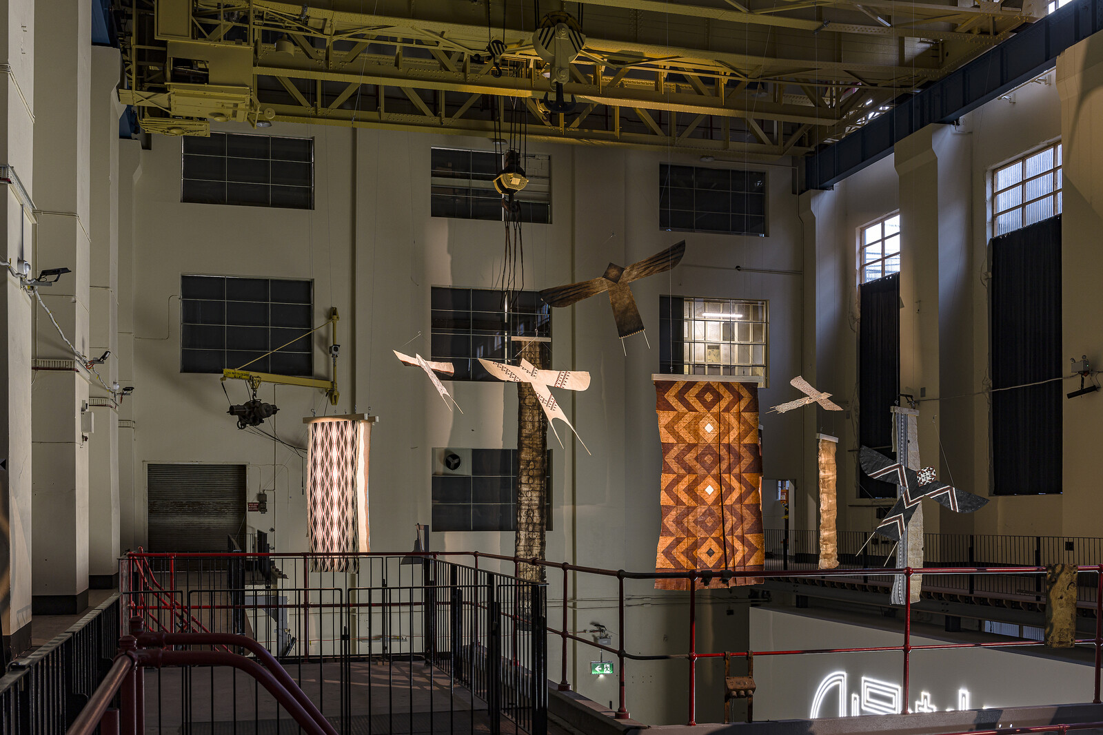 One floor below, Yankunytjatjara painter Kaylene Whiskey, in her mise-en-scène Kaylene TV (2023), places life-size cut-outs of Black women superheroes invented by the artist, alongside the rock and country legends Cher and Dolly Parton, in a gleeful analog television set decorated with dots recalling Aboriginal dotting techniques. Next to it, Alberto Pitta’s rich, patterned fabrics investigate the visual culture of Afro-Brazilian street bands. A former coal plant built in the 1910s, White Bay Power Station testifies to the extractivism that drives the enduring dispossession of Australia’s First Nations. Here, the spirit of the carnivalesque—Mikhail Bakhtin’s term for artworks that shimmer with dissenting gaiety—takes center stage, hinting at the instability of the colonial architecture.