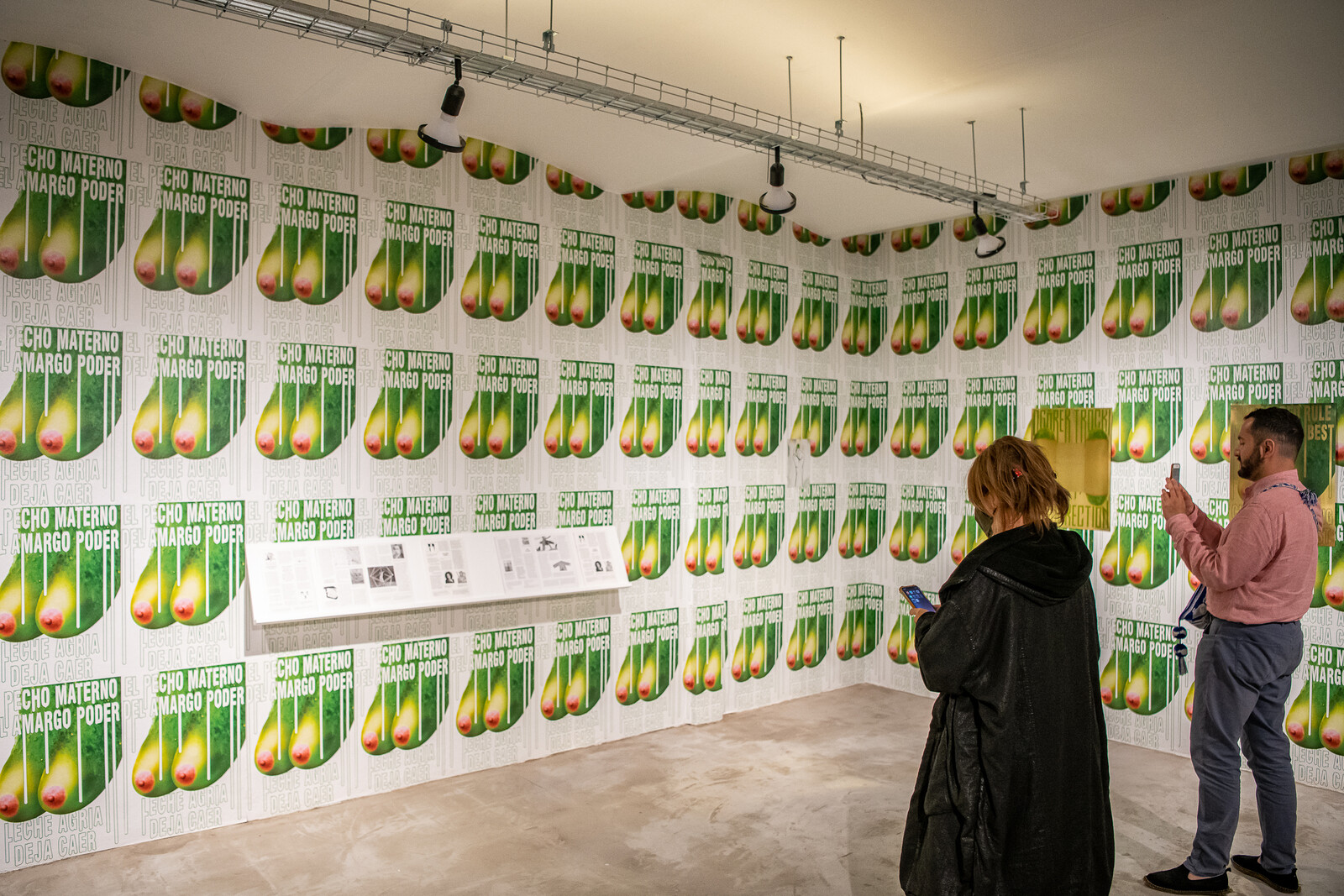 In roughly this vein, the presentation of Slavs and Tatars at the concept store Son de Aquí [They are from Here] felt more invested in attracting influencer attention than conveying specific ideas. Most of the show is dedicated to the collective’s signature graphic works that riff on linguistic slippages between Cyrillic, Arabic, and Latin alphabet cultures. The only local reference was on the upstairs bar, which was wallpapered with posters of pickles photoshopped with nipples over which drip the phrase: “El pecho materno del amargo poder leche agria deja caer” [The maternal breast of embittered power gives sour milk]. Again: no explanations. Just droopy pickle tits, sour power, and mezcal cocktails. Hacer Noche co-organizer Elise Durbecq explained that the downstairs space is “like a museum shop” offering limited editions while the bar hosts performances curated by Hacer Noche. About Slavs and Tatars’ work, she offered, “it’s very complex.”