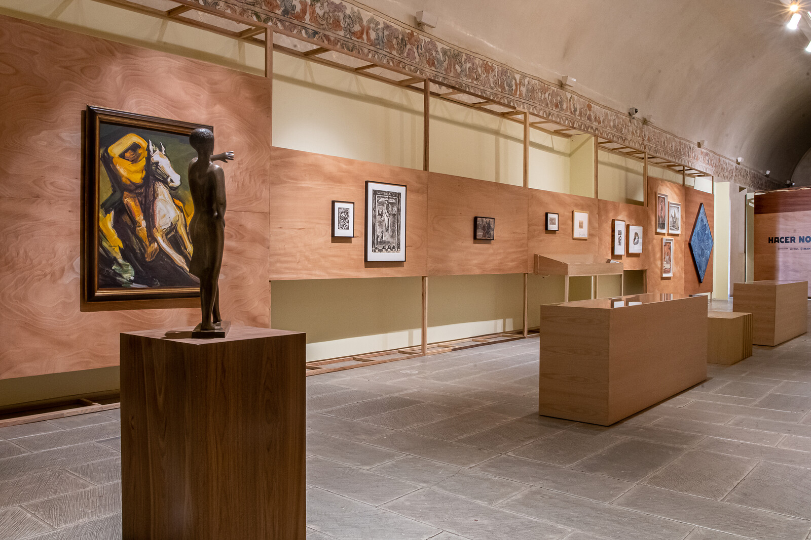 Santo Domingo is the primary cultural institution for one of the poorest states in Mexico. Hacer Noche’s audiences therefore range from rural residents whose mother tongue is one of sixteen regional indigenous languages to national and international tourists with every possible level of access to resources and education. It feels oddly exclusionary, therefore, to hide the scholarship behind the pairing of Tamayo and Siqueiros, whose paintings depicted the proletariat as the backbone of Mexican identity, with works by artists addressing international themes, such as the Mexican-American artist Elizabeth Catlett’s lino-cut Malcolm X Speaks for Us (1969). Elsewhere, pieces by Sudanese painter Ibrahim El-Salahi and Egyptian artist and feminist activist Inji Efflatoun flank a central vitrine of small drawings and puppets by Mexican artists Lola Cueto and Lola Álvarez Bravo. Ephemera from and clippings about Siqueiros’s visit to Egypt in 1956 from a Cairo newspaper suggest that the exhibition is proposing links between Black American, Arab, African, and Mexican art and activism—but with no translations from the Arabic, it’s difficult to know what.