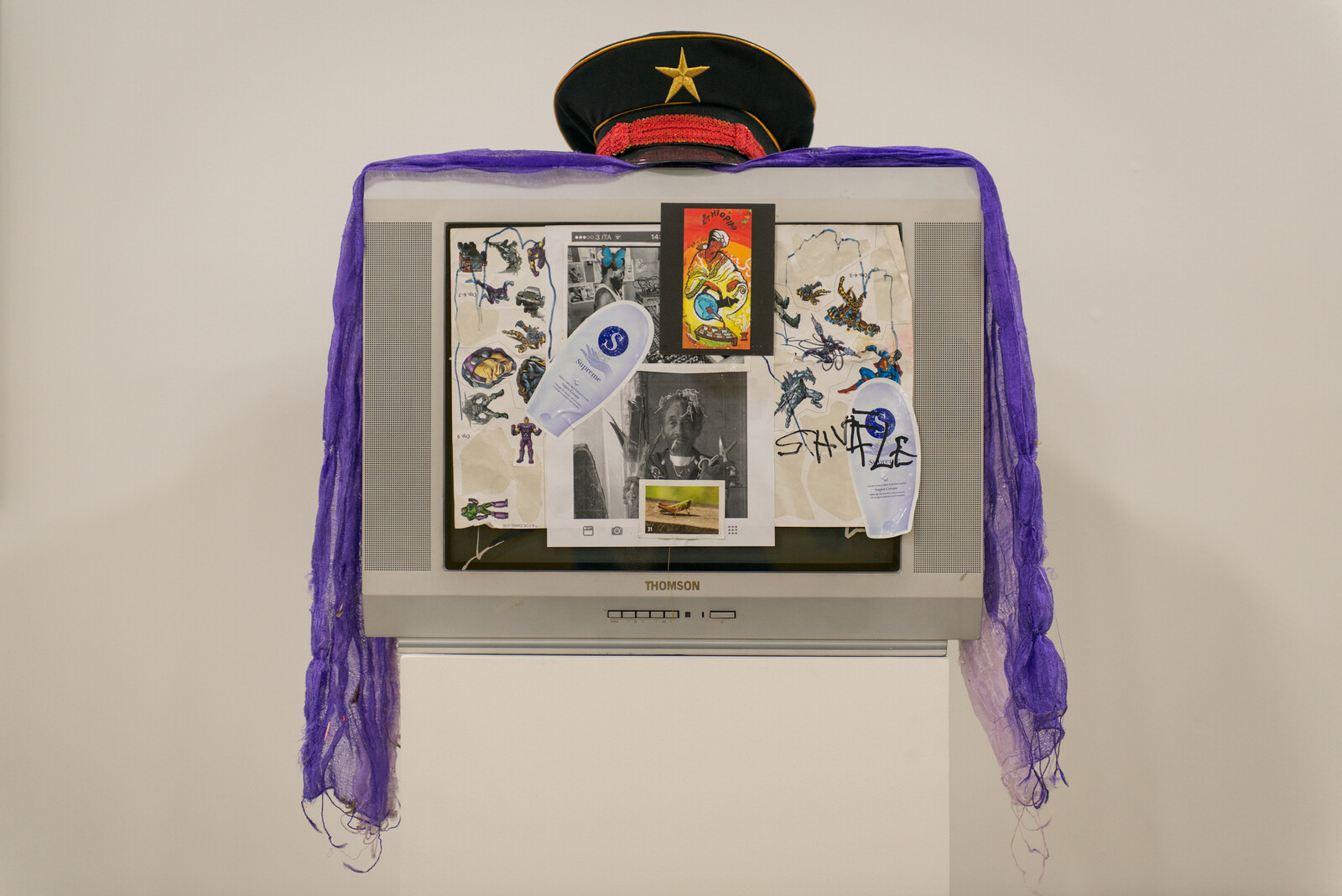 The show—curated by Jacopo Crivelli Visconti, alongside Paulo Miyada, Ruth Estévez, Francesco Stocchi, and Carla Zaccagnini—opens with the Santa Luiza meteorite, discovered in Goiás in 1921. This survivor of the 2018 fire that gutted the National Museum in Rio de Janeiro (and other cosmic misfortunes) makes a strong opening statement about the ruinous state of the underfunded cultural sector in Brazil (echoed, through the exhibition architecture, by dominant shades of black that conjure an atmosphere of mourning). Contemplation of the object is interrupted by the tinkle and flash of metal pieces being transformed by a hired grinder into makeshift knives, an illicit craft perfected by violent prisoners, as part of Paulo Nazareth’s eerie installation-performance Levante/Amolador de facas [Levante/Sharpener of Knives] (2021).