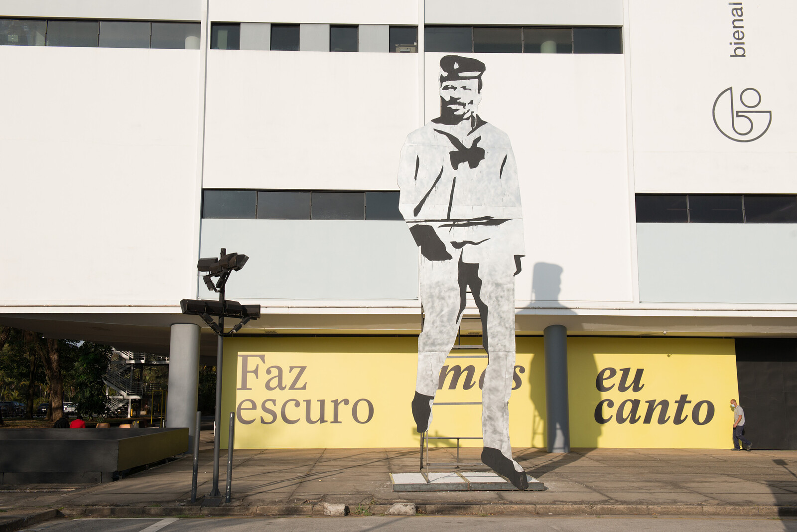 If the Bienals de São Paulo have historically been given nicknames—”Picasso” (1953), “Boycott” (1969), “Vazio” (2008), for example—the day before the opening this one was claimed, by Jaider Esbell, as the “Indigenous Biennial.” One of the key figures in this Bienal, Esbell’s work over the last few years in northern Brazil has been fundamental in articulating the Contemporary Indigenous Art movement: a program for the visibility of Indigenous art that is simultaneously aesthetic, spiritual, and political. In the context of ongoing invasions of Indigenous territories under the present far-right government, the biennial has sought once again to provide significant space to Indigenous artists, a commitment undercut by the lack of representation of Indigenous or Black researchers on the curatorial team. Nor is the power held by one of the longest-running biennials in the world a subject of much reflection or critique, with the notable exception of Andrea Fraser’s performance-video Reporting from São Paulo, I’m from the United States (1998), originally commissioned for the celebrated “Bienal da Antropofagia.”