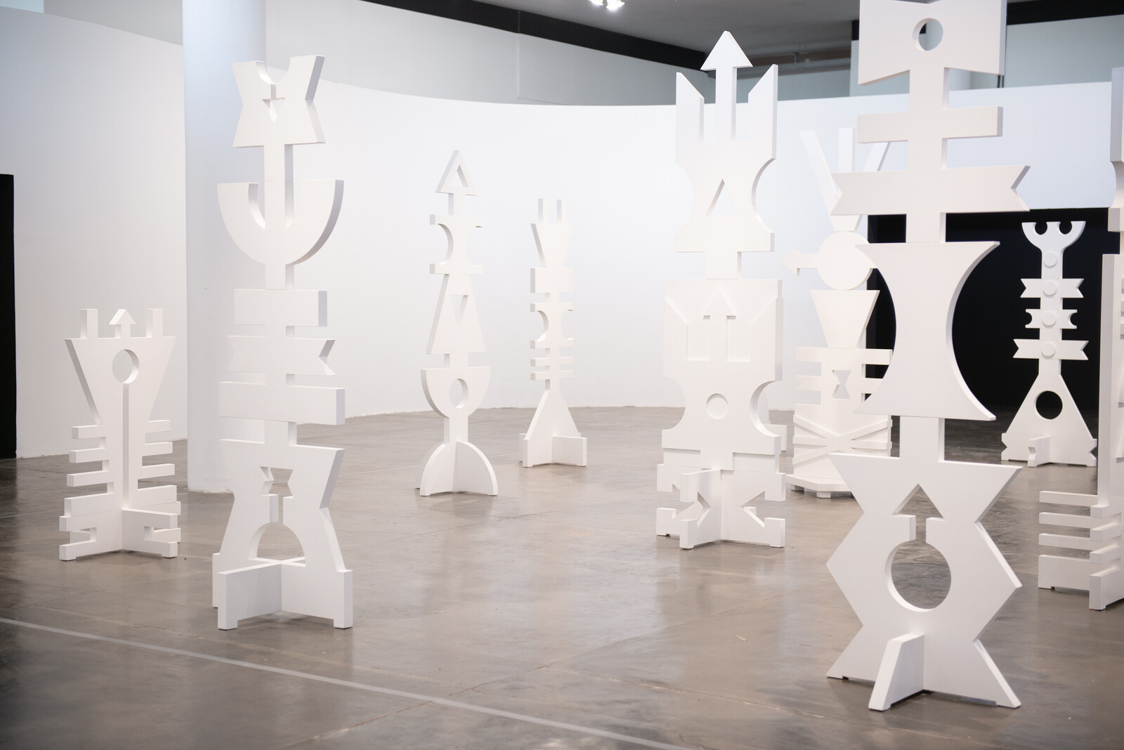 The late artist and curator Emanoel Araujo was also the founder of the Museu Afro Brasil (among other institutional roles), and the wall text for his large relief of white diagonals mentions how the piece was directly inspired by the work of Bahia-born artist Rubem Valentim: his Templo de Oxalá [Oxalá Temple] was first exhibited (partially) at the 14th Bienal, in 1977. Here, the twenty white sculptures comprised of stacked arrows, circles, and other rudimentary shapes recall the symbols for currencies, religions, flags and other modern systems of control—but in their vertical configurations they also resemble totems denoting some other kind of metaphysical character.