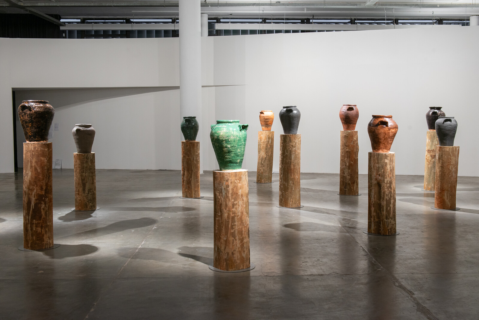 Scattered across the building are three pieces featuring collections of ceramic vessels: the expanse of upturned pots in Ibrahim Mahama’s Parliament of Ghosts (2019); the forty-four broken urns and bowls that hold hardened cement rather than water in Marilyn Boror Bor’s Nos quitaron la montaña, nos devolvieron cemento [They Took the Mountain From Us, They Gave Us Back Cement] (2022); and M’barek Bouhchichi’s amphoras inscribed with rewritten poems by Black writers from multiple continents, displayed upright on a grove of tree trunks with flattened tops (“Nous somme ce que vous ne voulez pas voir,” or “We are the ones that you don’t want to see,” reads one). Whether incidental or not, the patterning of formally similar work—carrying different metaphors and from far-flung contexts—parallels the constant refrain of colonial histories throughout the show, which feels less about repetition than about representing distinct struggles that have iterated around the world across generations.