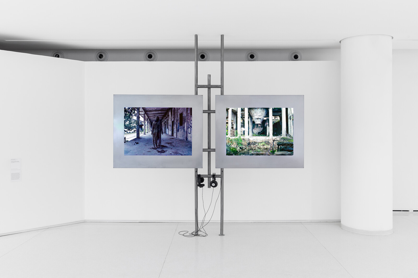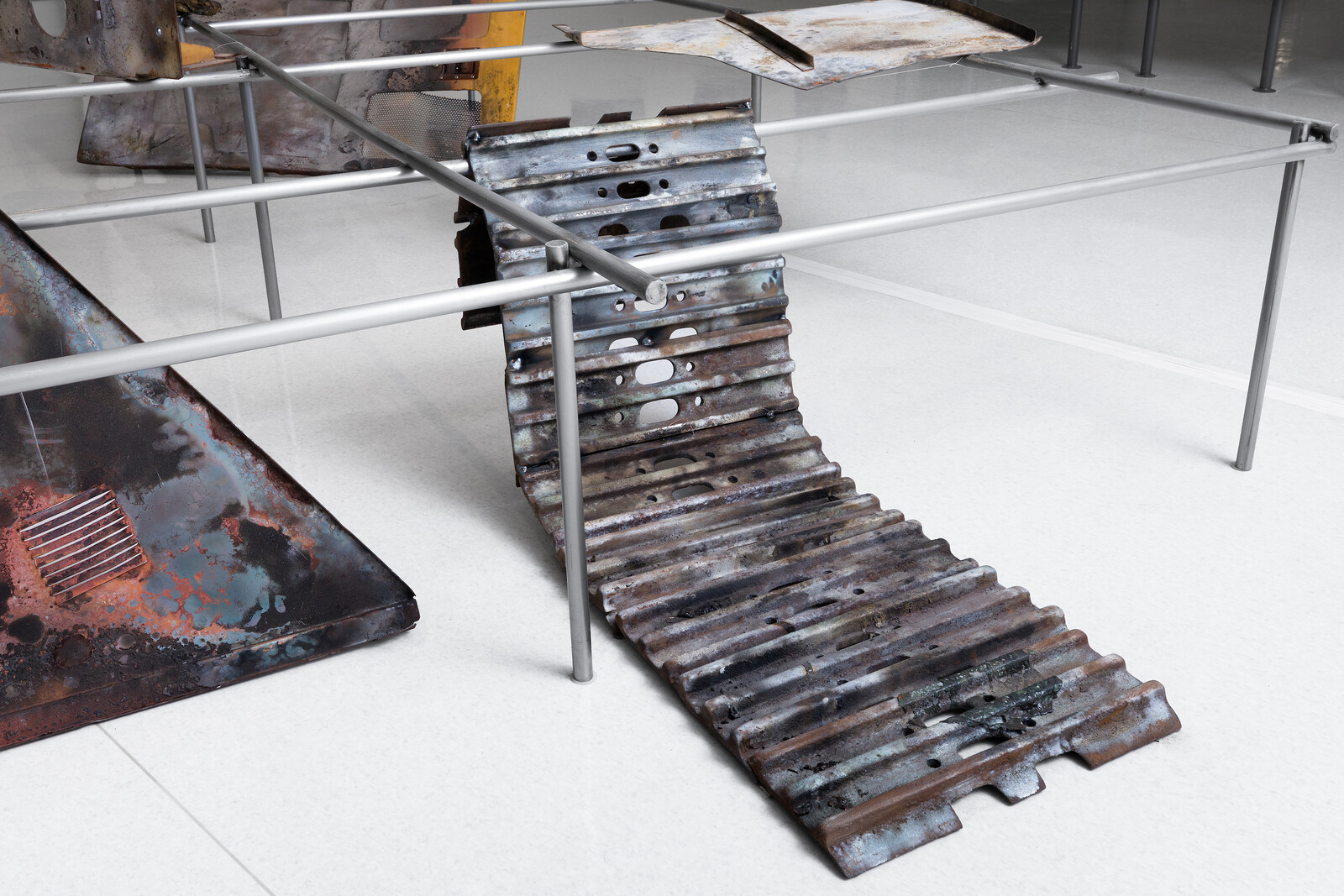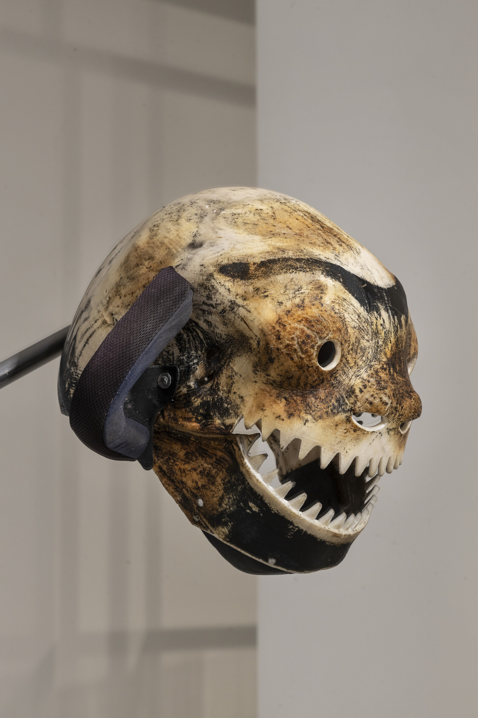The Tupi people roasted their prisoners on a grill called a “moquém” before eating them in anthropophagic rituals.1 Frederico Filippi’s Moquém - Carnes de caça (2023–24) presents the fragments of two tractors incinerated during a Federal Police raid in Itaituba, Pará, on just such an iron grid. The installation riffs on interrelated struggles—people versus machines and among themselves, and machines against each other—to produce an absurdist allegory on the suicidal nature of certain forms of “progress.” Nearby, Zimar’s jesting zoomorphic masks, Careta de Cazumba (2024), traditionally worn in parades and here made from found materials, such as motorcycle helmets, PVC, rubber, wigs, or animal bones, appear to be mocking Fillipi’s charred materials. Zahỳ Tentehar’s short science-fiction video Máquina Ancestral: Ureipy (2023), on the opposite wall, shows the artist wandering through a ruined factory in the jungle. This triad of works proposes a critical reading of excessive industrial ambition, and of the relationship between ancestral Indigeneous traditions and capitalism. They represent the boiling point of this heated 38th edition of Panorama, the biennial temperature-check of Brazilian contemporary art.