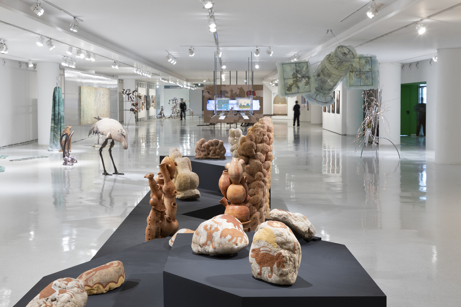 At one end of the room are works by the artist and spiritual leader Dona Romana (a mural-sized photograph of her carved stone pieces dating from 1989), clay sculptures by Mestre Nado and Sallisa Rosa, Paulo Pires’s sandstone sculptures, stones painted with animal motifs by Maria Lira Marques, and drawings by Joseca Mokahesi Yanomami (who also exhibited at Venice this year). This section displays visual languages linked to worldviews that, just a few years ago, were not the subject of attention from the mainstream contemporary art system. In many cases, they were not made to be shown in a white cube or museum context—these are limited and idiosyncratic spaces, at least when it comes to displaying works and objects made not to be admired for their appearance but for their spiritual value or symbolic use. The large-format photograph of the stones carved by Dona Romana, for instance, flattens a ceremonial open-air space into a two-dimensional image.