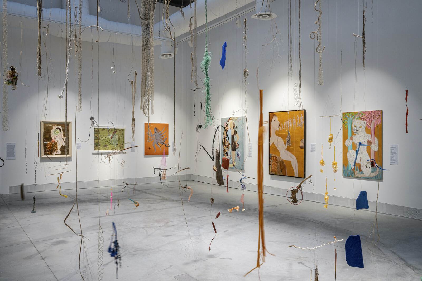 The Indigenous thinker and elder Davi Kopenawa notes of white people: “They sleep without dreams, like axes abandoned on a house’s floor. Meanwhile, in the silence of the forest, we shamans drink the powder of the yãkoana trees, which is the xapiri spirits’ food. Then they take our image into the time of dream. This is why we can hear their songs and contemplate their presentation dances during our sleep. This is our school to really know things.”3 In an exhibition devoted to material metamorphoses and earthly entanglements, it is not surprising to see, in 2022, an emphasis on Indigenous practices, as well as works by non-Indigenous artists invested in ancestral epistemologies. Amazonian and Sámi artists are well represented, as are many incredible artists from the Caribbean and the Americas, whose works draw on certain pre-Columbian iconographies: the wonderful Myrlande Constant of Haiti and her virtuosic glass-beaded Vodou flags of sirens, Chilean Sandra Vásquez de la Horra’s incalculably moving accordion-folded drawings of mythic female figures sealed with beeswax, and Mexican painter Roberto Gil de Montes’s admixture of Mexican modernism and Huichol iconography (his Los poetas en el mar, from 2021, took me home).