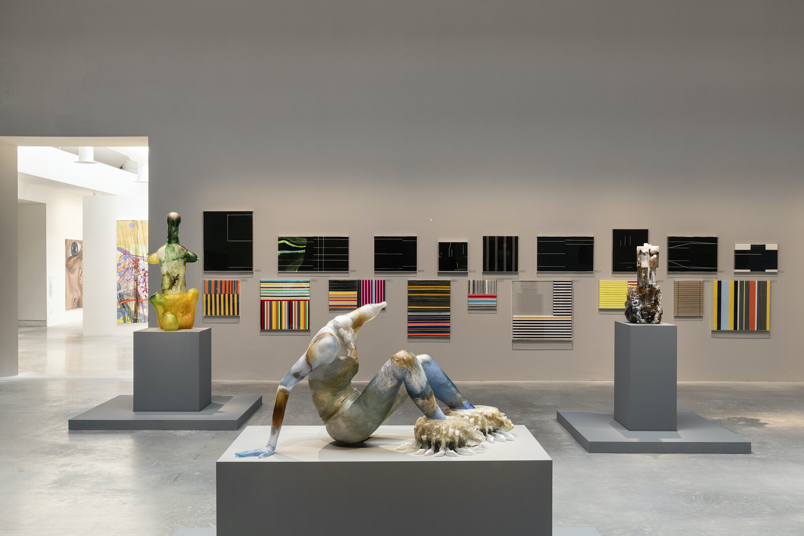 A more elusive thread, which I will try to pull as tightly here as I can, links a reprise of finish fetish and its American West Coast ancestry to newer offspring. Monira Al Qadiri’s fantastic, nearly iridescent rotating sculptures; Teresa Solar’s enormous crab claws, gleaming like cars at golden hour; Christina Quarles’s stunning suite of paintings of fluorescently attenuated figures, her neon brushwork nervy and thick or latex-tight and almost airbrushed; Tishan Hsu, my first and only sculpture professor, whose unsettling series of sci-fi reliefs, at once screens and skins, are phenomenological and suffocating in equal measure. It all reminded me of a kind of California dream—not of my Southern California childhood but of those that preceded mine, for I was not then alive, as well as those that have now come after.
