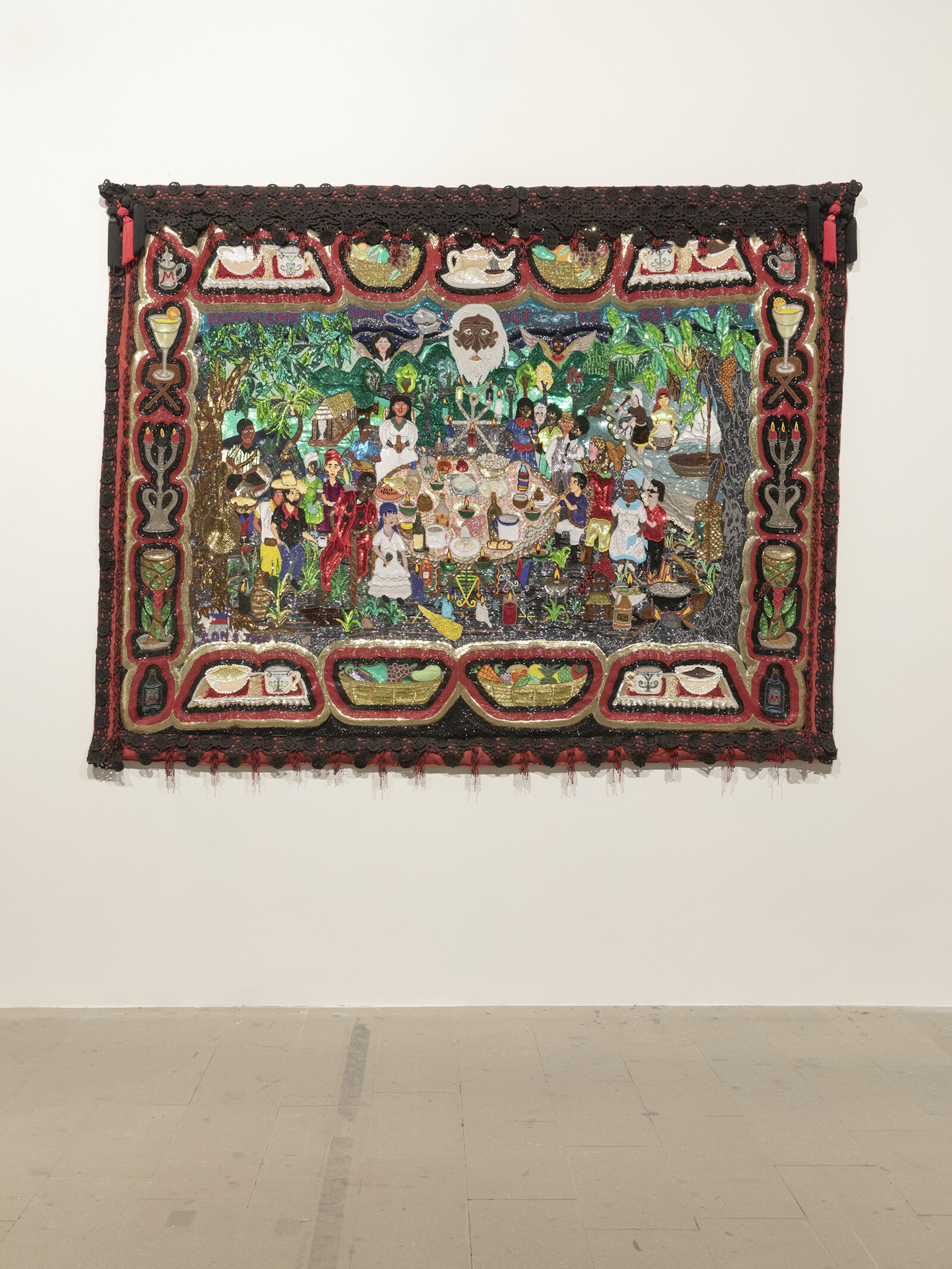 The late Macuxi artist, curator, and activist Jaider Esbell, who died by suicide last year, is represented by a series of six paintings, his electric brushwork of frogs, cows, and other visionary animal spirits, glowing, irradiating, from black fields. His loss is felt here, as well as in Delcy Morelos’s installation that fills the same room: Earthly Paradise (2022), a field of earth the height of a child, its scent deep and dank and wonderful, tangible even through my mask. Raised in Indigenous Embera territory, and educated in Cartagena, Morelos’s monumental earthen works—inspired by her study of Amazonian Witoto thought, evoking de Maria—suggest both end, here, and origin.