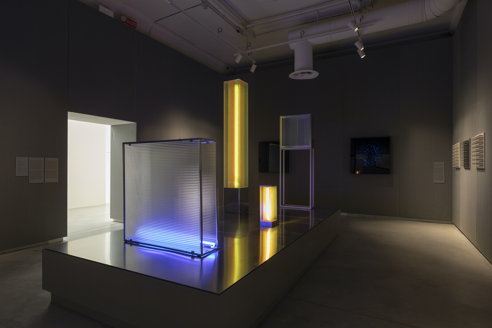 Such hybridity, though, can be prosthetic as well. Technologies—of gender, apparatus, machine, performance, colonialism, expropriation, racial capitalism, language, painting—are everywhere, not often in the expected guises. There is little video, for example. Not much photography. Have you ever seen so much painting? everyone asked. Yet the rooms devoted to technology or its early aesthetic forms are brilliant: from the “Seduction of the Cyborg” capsule, with its eighties-era totemlike figures by Liliane Lijn, the thirties-era aluminum reliefs of Regina Cassolo Bracchi, and the bodily anagrams of Kiki Kogelnik, all less self-blazoning than self-creating, to works by Lucia Di Luciano, a founder of Gruppo 63, whose matrices of black-and-white paintings on Masonite kept my eyes glued to them. Like weaving, they suggest the warp and weft of labor, crossover, rigor, architecture, a suffocating psychological interior and architectonic exterior both.