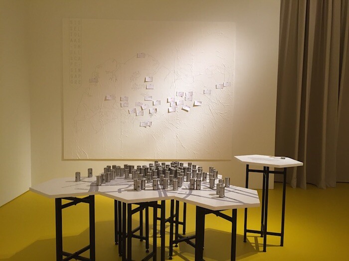 The former takes its point of departure from the practice of Hong Kong-born Singaporean architect William S.W. Lim (b. 1932) and the Asian Urban Lab, an initiative started by Lim and his colleagues in 2003. Curated by Ute Meta Bauer, Khim Ong, and Magdalena Magiera, this exhibition explores Lim’s many treatises on architecture and urbanism from 1950s Singapore through commissioned projects from contributors such as Laura Miotto, Mark Glode, Sissel Tolaas, Etienne Turpin, and Shirley Surya. Miotto’s Mega Living Room (2016) takes the form of a support structure in the main exhibition space, creating a living room where points of social interaction can take place. Referencing Lim’s proposal of upcycling, Miotto’s installation re-uses display elements from earlier NTU CCA exhibitions. These are interrupted by organic wall displays of quotations, quotes, articles, images, and printed material gathered in Surya’s Tracing and Placing “Incomplete Urbanism” (2016), which attempts to chart Lim’s role relative to Singapore, critical urban ethics, and activism. The idea of the urban is stretched through other tangible experiments, including Tolaas’s SmellScape Singapore 2/42 (2016), which creates an invisible landscape through the use of the olfactory sense.