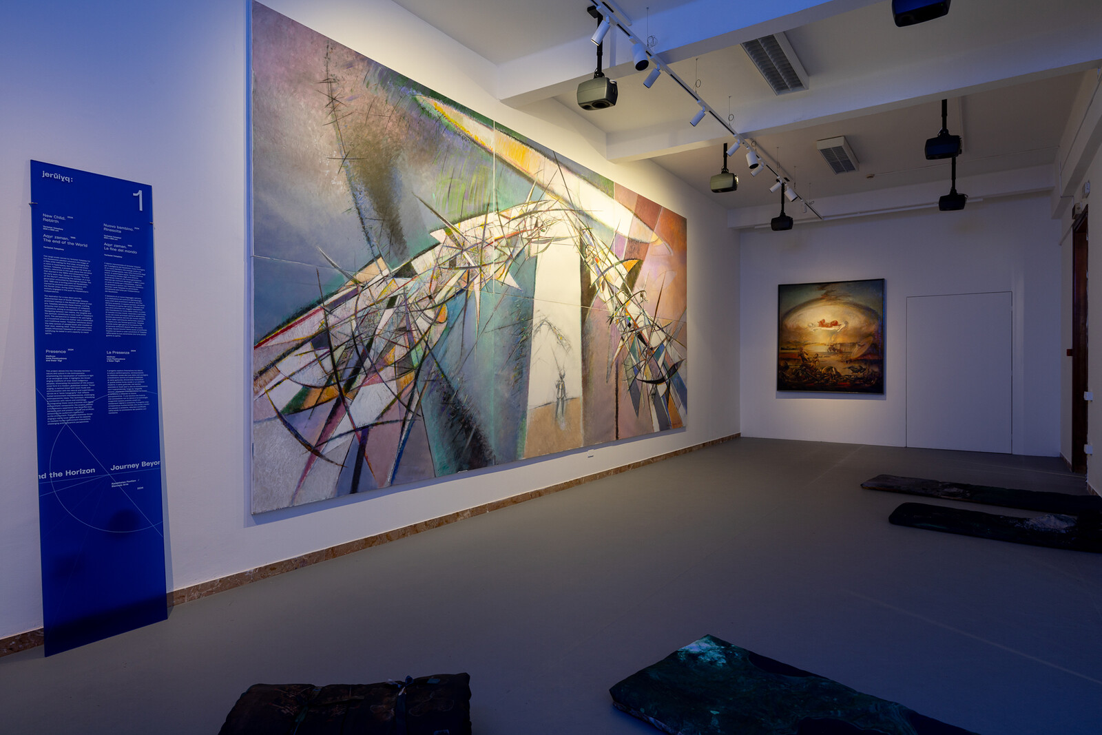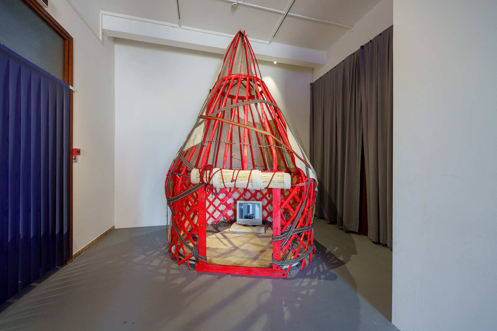The Kazakhstan Pavilion, meanwhile, constructs something like a decolonial futurism. It takes the first part of its title “Jerūiyq: Journey Beyond the Horizon” from the mythical country of abundance described in ancient Kazakh legends, interpreted by the curators as a “Kazakh Wakanda.”6 Six artists and collectives— Sergey Maslov, Saken Narynov, Yerbolat Tolepbay, the2vvo (Lena Pozdnyakova and Eldar Tagi), Kamil Mulashev, and Anvar Musrepov—are paired across three small rooms. The exhibition combines paintings, sculptural objects, installation, sound, and video-essay, produced between 1979 and 2024. Conceptually the show oscillates between the dialectic poles of utopia and dystopia, neo-traditionalism and modernism, mythological and secular, cosmic space and land (in this case, the steppe), presence and absence. However, the works of art tend to collapse these binaries: as, for example, in the image of a “cosmic nomad” in Maslov’s installation, or the idea of post-apocalyptic shamanism as an advanced cosmotechnic in Musrepov’s video. If one of art’s functions today is the production of transcendence, then this post-secular transcendence often works through the geographical imagination, giving form to that immanence in the retrieval of such mythical lands as Jerūiyq, the legend of which has been passed down for centuries via the oral tradition.7
