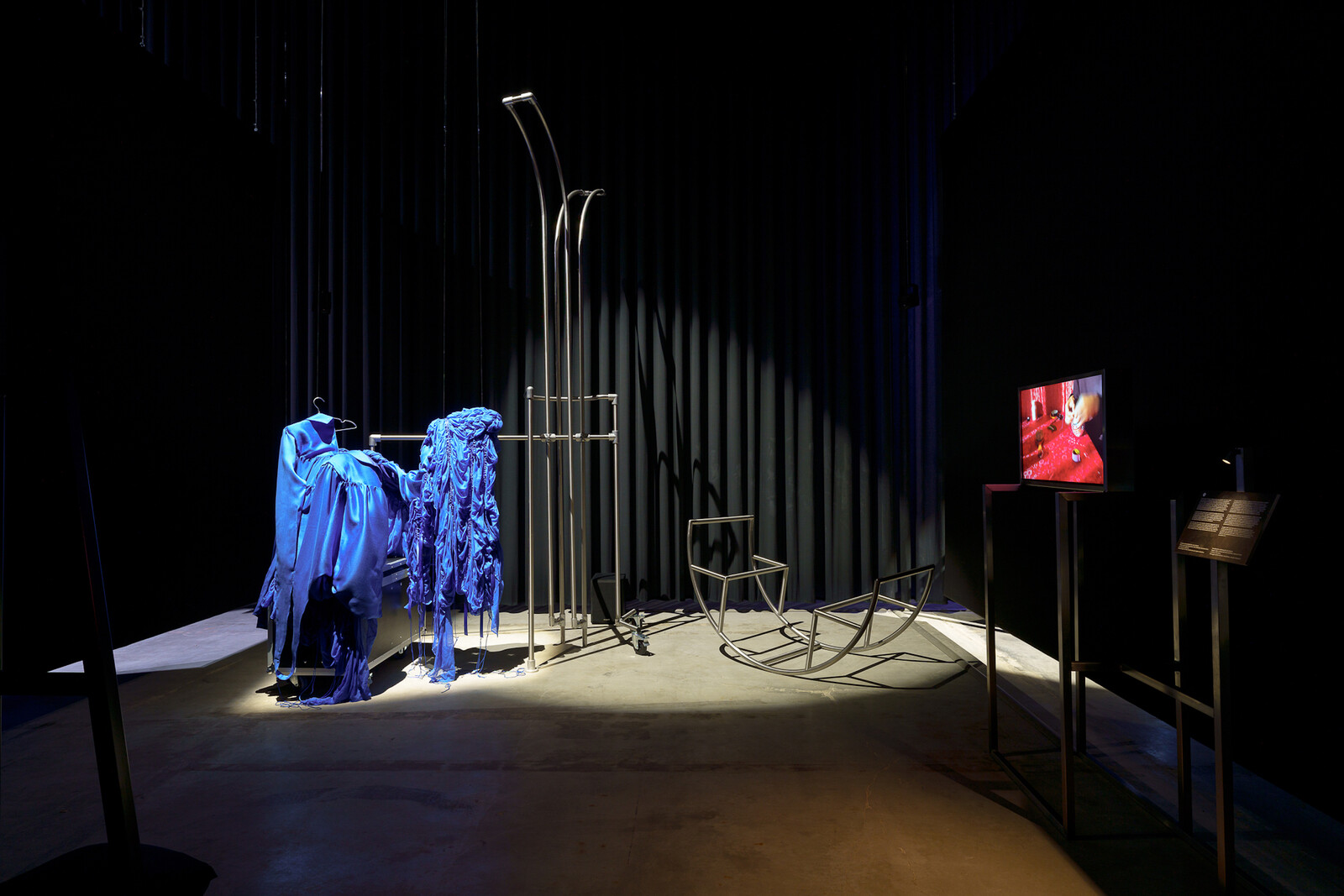 What is notable, despite the differences, is that art from Central Asia is forced to foreground its own postcoloniality, decoloniality, or indigeneity as a condition of entering a global art world which is preoccupied by identity. (Here I must acknowledge my own position, as someone grateful to the Kazakh and Uzbek—particularly the Tashkent—art communities for their invaluable support during my emigration from Russia in 2022-2023.) The Uzbekistan Pavilion presents a “speculative theater” of postcolonial multiculturalism.4 Artist Aziza Kadyri collaborated with the grassroots feminist collective Qizlar (the word means “girls” in Uzbek) to produce “Don’t Miss the Cue,” which centers on women’s personal memories of migration. Sculptural objects—composed of suzani, patchworked textiles, and modified storage racks supplemented by screens and sounds—are presented in a darkened space. Rather than direct social commentary, the title suggests a stage in which imaginative and generalized migrant women from Uzbekistan, along with the visitors following them, perform “a quest for visibility,” a desire that Kadyri also “craved as a younger migrant woman.”5