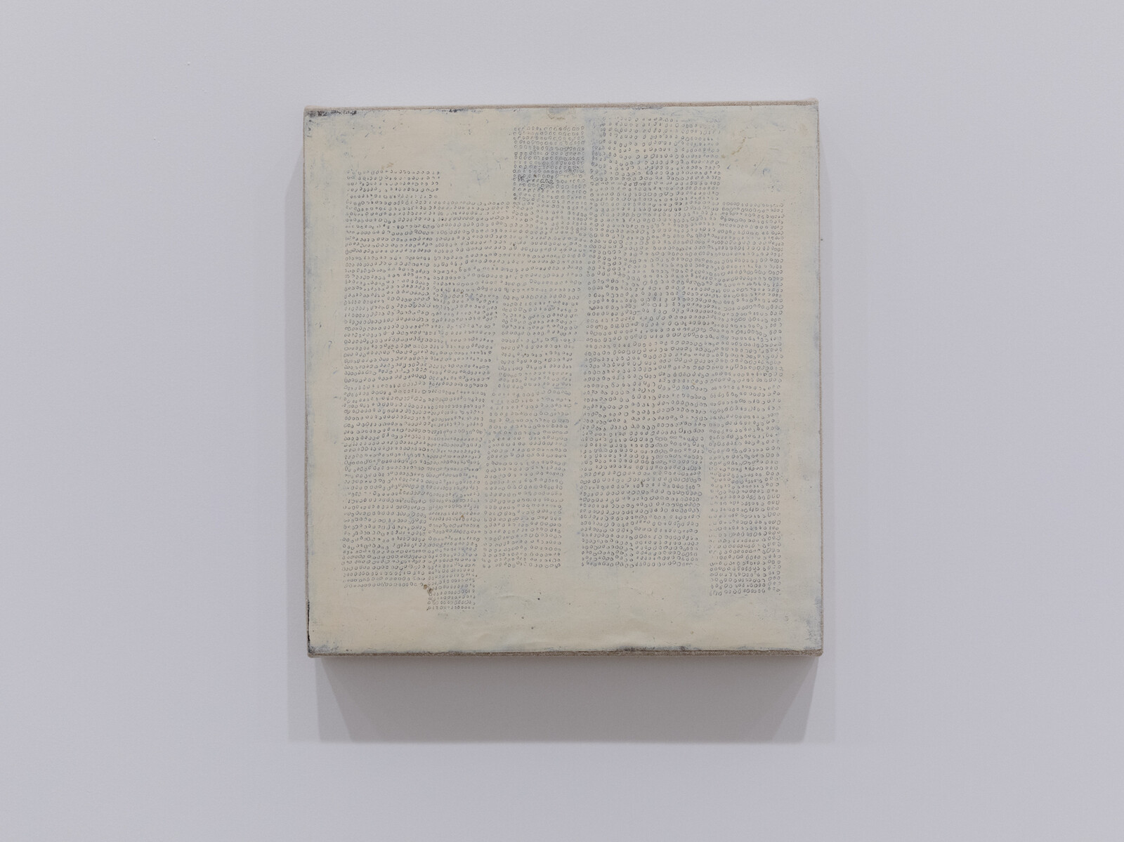 That legibility is not consistent with significance is driven home by Romany Eveleigh’s mesmerizing paintings. Consisting of repeated O’s scratched into white paint, they call to mind a passage in Anne Boyer’s Garments Against Women (2019) reflecting on Jean-Jacques Rousseau’s justification for the intellectual inferiority of women. Observing a little girl who would “write nothing but O’s; she was always making O’s, large and small,” and who gave up writing once she saw herself in the mirror, Rousseau concludes that linguistic facility was secondary in women to the desire to be beautiful.3 Eveleigh’s paintings might be taken as support for Boyer’s counterargument that these O’s constituted the girl’s secret language and infinitely expanded literature, “each O also an opening, a planet, a ring, a word, a query, a grammar. One O could be an eye, another a mouth, another a bruise, another a calculation.”