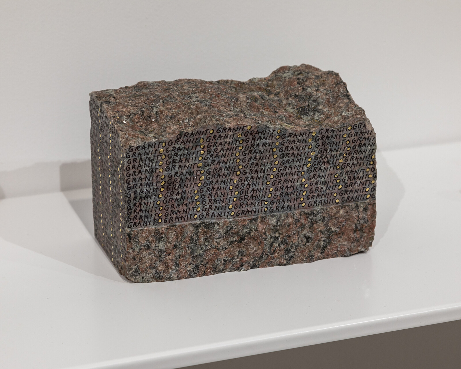 The clearest expression of the decentering potential of art remains Arthur Rimbaud’s “I is another,” and it might be because poetry is so well adapted to using a shared medium to express feelings exceeding its conventions that I found myself drawn to works operating at the points at which language breaks down. Onto the hunks of marble, granite, and quartzite that comprise her sculpture series “Scritture” [Scriptures] (2020–23), Greta Schödl has handwritten the words that signify the rocks in Italian—respectively marmo, granito, and quartzite—in repeating lines that fill the flat surface with characters, burnishing the holes at the center of the initial “q” or conclusive “o” with gold leaf to create a visual rhythm. This doesn’t read like an Adamic act of naming so much as a recognition of the insufficiency of the word and the concept it circumscribes to fully account for reality. The failure of language here breaks open the world, insisting that the viewer attend to the living strangeness of even the most inert material. It’s a little like the experience of repeating a word so many times that it not only loses its conventional meaning but becomes music.