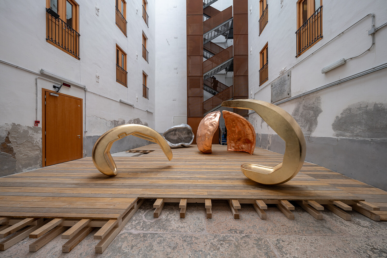 Shawky’s script takes creative license with the facts—painting the revolution’s “Franz Ferdinand moment” as a plot between British and Maltese consular representatives—but its simple score and rhythmic choreography offers an elegant reminder of how histories define communities through their transformation into myth. Taking a similar approach to the critique of colonial intervention, Mounira Al Solh’s “A Dance with her Myth” at the Lebanese Pavilion inverts the story of the rape of Europa with an installation of bright gestural paintings, drawings, and faux-naif ceramic masks to imagine what she calls in the wall text “a destiny freed from gods.” At the Serbian Pavilion, Aleksandar Denić’s “Exposition Coloniale” is an immersive disaster Disneyland installation of maybe post-apocalyptic, maybe Soviet-era film set vignettes. The piece piece is particularly suggestive given Serbia’s increasingly autocratic leadership and rejection of Kosovar sovereignty—The Republic of Kosovo Pavilion won a special recognition from the jury for Doruntina Kastrati’s installation exploring labor conditions in the transition to a free-market system after the 1999 war.