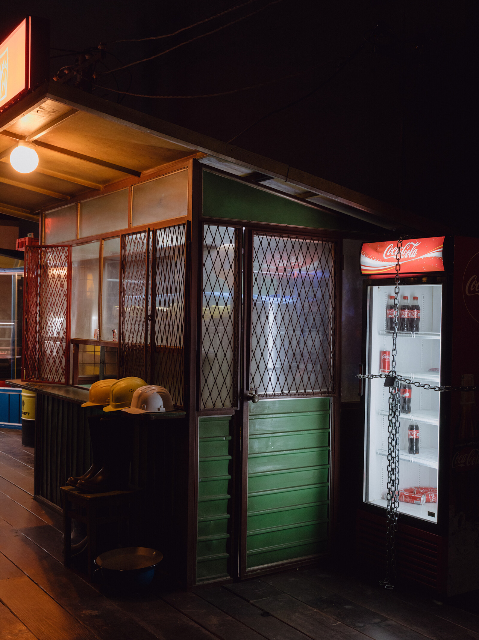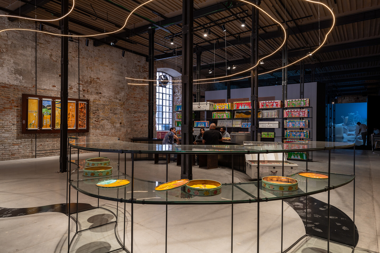 The title of “Don’t Miss The Cue,” by Aziza Kadyri and Qizlar Collective at the Uzbek Pavilion, links a theater curtain installation with the Uzbek government’s recent focus on contemporary art as a diplomatic tool on the world stage. This presentation by nine Uzbek women artists combines traditional crafts with emerging technologies to reflect on issues of identity and domesticity. Loosely reminiscent of Martha Rosler’s Semiotics of the Kitchen (1975), Qizlar Collective’s five videos present portraits of women wrestling Gen Z steppe identity: international influences, political realities, and local traditions. “Sites of Memory, Sites of Amnesia” by Abdullah Al Saadi at the UAE Pavilion similarly emphasizes memory, landscape, and poetry in the formation of identity. Framed around his bicycle trips through the Arabian Peninsula, the exhibition gathers painted rocks, hand-drawn maps, and lyrical drawings. Most are stored behind a counter in brightly colored lunch tins which docent performers open and explain to viewers, grounding the project in personal connection.