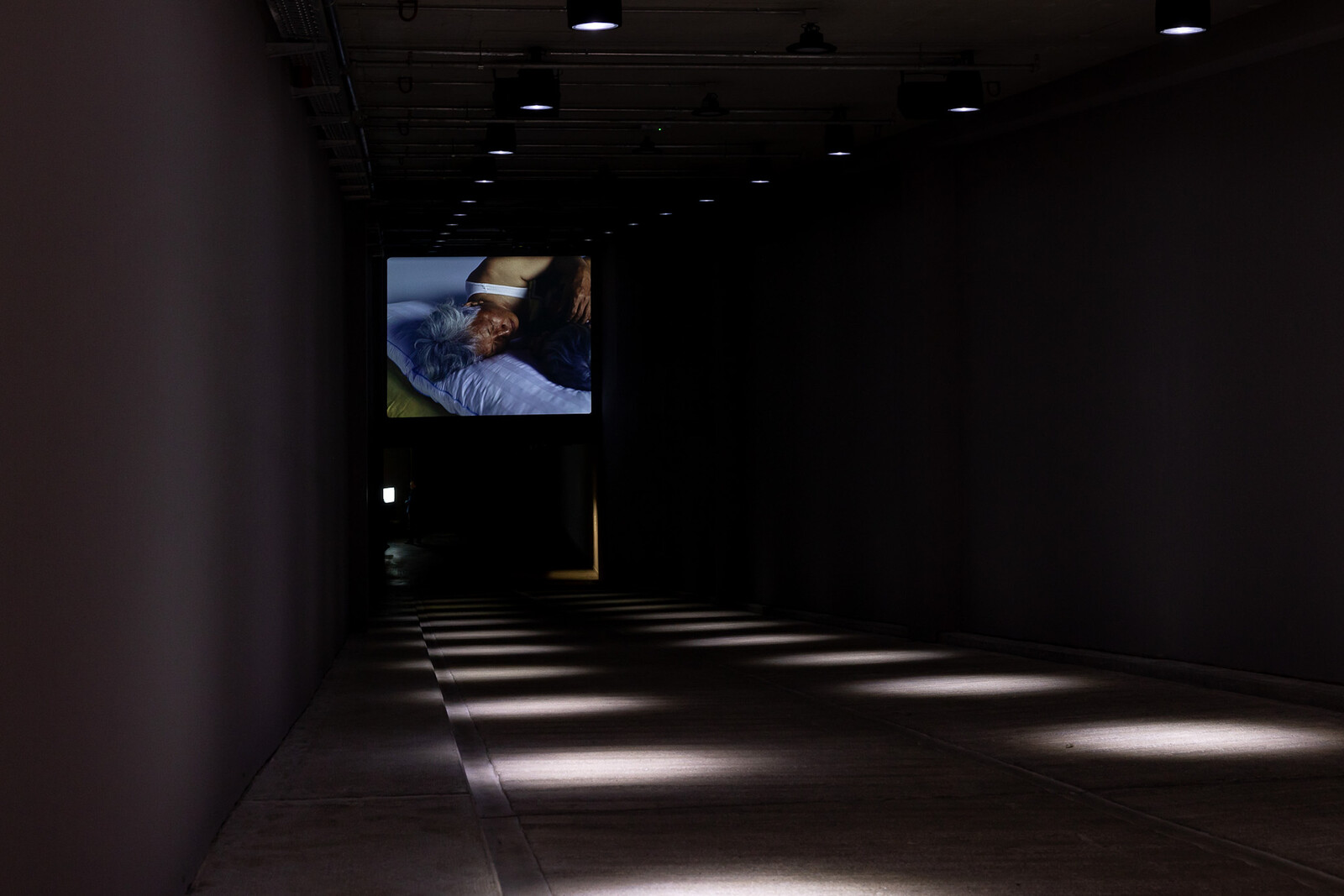 In Betonhalle’s entrance corridor, Tenzin Phuntsog’s Dreams (2022) set up the exhibition’s dream-like ambience. The work portrays a sleeping couple— immigrants from Tibet to the US—floating in space against a quiet, blueish monochrome background. The pair reappear in a two-channel video, Pala Amala (2022), posing silently in nondescript settings. These large-screen, meditative works sat in contrast to the small, phone-like screens which presented short fragments of domestic videos sent from Tibet. The effect was to emphasize disjuncture and distance, filling the space with memory and longing. Tamer El Said’s Borrowing A Family Album (2023)—an installation of still and moving images, fragmented, reshuffled, animated and circulated through multiple distributed screens—also conveyed an ambiguous sense of loss and haunting memories, employing found amateur footage shot in 1960s Athens. These blurred glimpses from the past provoke an eerie sense of familiarity: the subtle beauty of this work was in its proposition that reliving one’s past through someone else’s story is possible.