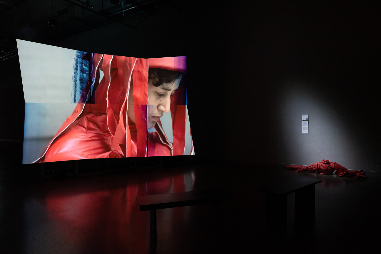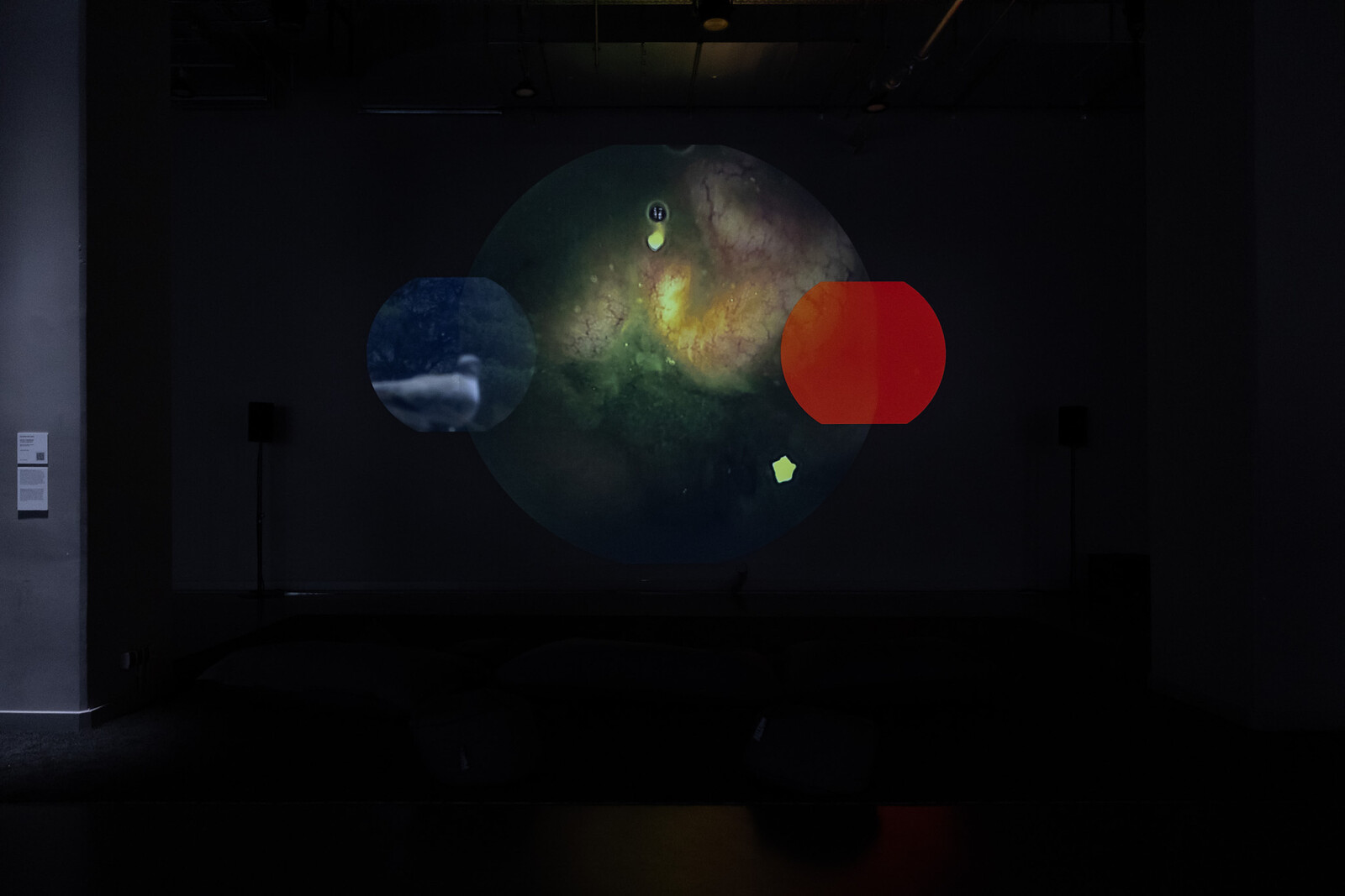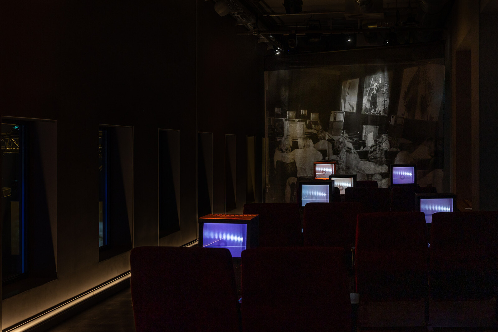 In a section dedicated to “expanded cinema,” several works experimented with fresh ways of presenting and receiving moving images, beyond the classic combination of projector, screen, and dark room. Among these formats were Walid Raad’s waterfall projection Comrade leader, comrade leader, how nice to see you (2022), which brought a touch of irony and strange relativism, or Un Gif Larguísimo [A Very Long Gif] (2022) by Eduardo Williams—a gigantic video of a swallowed-pill camera that travels through the digestive system, accompanied by smaller videos where a telephoto lens is glazing over a distant urban landscape—which combined the ultimate embodiment of the gaze with an effective disembodiment. The show also paid tribute to Arsenal’s history—and that of experimental film—by showing series of works by the recently deceased Takahiko Iimura and Michael Snow, both of which pay particular attention to the materiality of moving images and the screens. The screens and projections were presented like floating islands, with their subjects often long dead or stored safely in the archive, or, even if slightly politicized, reduced to memory-dreams. Old CRT-TV sets served as a reminder of how new technology has offered the opportunity to broadcast and relate to the most pressing events. But here, liminal spaces, like dreams, video tapes, and archives only mimicked a sense of urgency that was, in fact, kept at a safe distance.