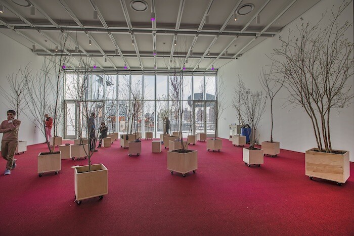 Earnest to a fault, painting could be said to carry on here as a metaphor, but this time, for the biennial itself, which probably helps account for its conspicuousness. Barring a few exceptions, the general spirit of this biennial is earnest, sincere, and totally committed. This spirit is not limited to the painting, but extends to everything from Sky Hopinka’s lyrically beautiful video Visions of an Island (2016), which is a portrait of Saint Paul Island in the Bering Sea, to Asad Raza’s Root sequence. Mother tongue (2017), an installation that consists of box-potted trees which are commented upon by wandering mediators, to Chemi Rosado-Seijo’s Jef Geys-esque transposition of a local grade-school classroom to the Whitney (Salón–Sala–Salón (Classroom/Gallery/Classroom), 2017), and a selection of works by Jessi Reaves and Sky Hopinka to the classroom itself. But nowhere is this earnestness more evident than in a great deal of the painting on view, from Aliza Nisenbaum’s colorful, richly patterned portraits to Shara Hughes’s florid and fantastical landscapes to Celeste Dupuy-Spencer’s endearingly wonky portrayals of everyday American life. I think this earnestness has less to do with the curators’ taste than with a will to register a recent late-Obama era cultural paradigm shift away from the tired, self-satisfied irony of the blasé privileged few toward something much more preoccupied with a shared human experience, which registers through sincerity, empathy, and nuances thereof. Curiously, this shift, which essentially moves from exclusion toward inclusion, is enacted precisely through excluding those who have traditionally excluded (through irony): white male painters. It just so happens that there is not one in the whole show. I have no idea whether this was intentional or if it just happened as a natural byproduct of the alleged paradigm shift. But here’s the thing: while I am happy to see this paradigm shift from irony to earnestness formally registered in a survey as important as the Whitney Biennial, I am also a little skeptical of its purchase in our current political climate. I am both scared and forced to acknowledge that Trump, his sinister administration, and the circumstances surrounding his election (not to mention Brexit and the refugee crisis) seem to have inaugurated if not yet another paradigm shift, then a general mood of radical uncertainty (as well as philistinism—indeed, isn’t it funny without being funny at all how fascism is actually a form of radical and humorless philistinism, such that to put to fascism, humorless, and philistine in the same sentence is tantamount to indulging in reckless pleonasm). An embrace of empathy, sincerity, etc., almost feel like markers of a halcyon period which was in fact just yesterday. This is not to say that they no longer matter—perhaps they matter more than ever—nor is this to imply, at all, that art should struggle to reflect its current moment, as in be intentionally topical. Rather, maybe when it does reflect its moment, that moment is already past. And that maybe this biennial might be a lot more elegiac than we think. I don’t know.