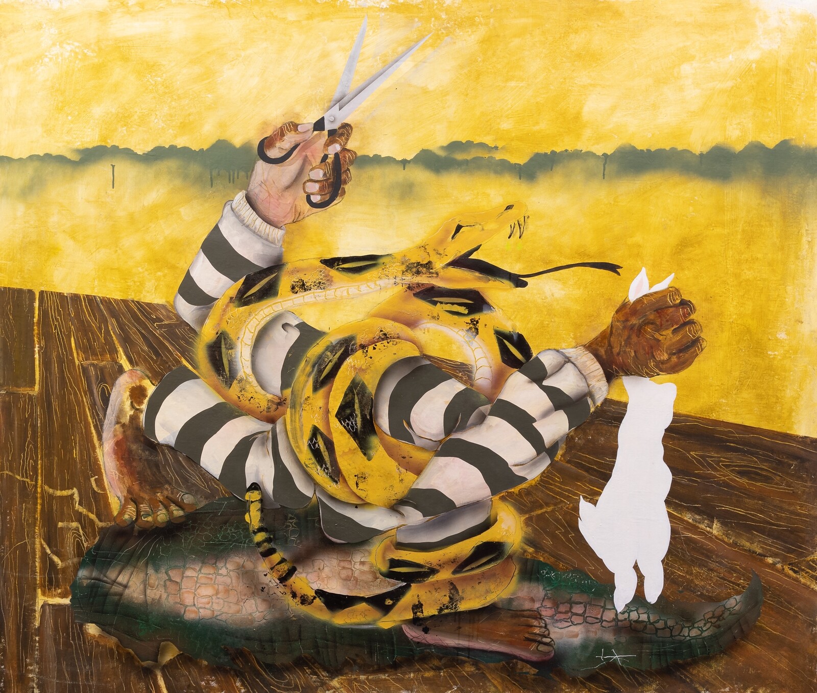Remember when America was hard to see? Boy, is it obvious now.1 The Whitney Biennial 2019, curated by Jane Panetta and Rujeko Hockley, has a marked interest in the alter-local, doing some overdue national soul-searching, as well as catching up to artists who have been doing this kind of reparative work all along. There is Joe Minter from Birmingham, Alabama, whose assemblages of rusty tools and metal imagine an “African village” in America, a stunning euphemism that is lost on no one. The agglomerations of plant matter and mass commodities by Puerto Rican artist Daniel Lind-Ramos (such as Maria-Maria [2019], in which an emergency FEMA tarp clothes a Virgin-like figure) are at once elusively bitter, ritualistic, and ruthlessly compromised, like a straw on a Caribbean beach. Curran Hatleberg’s lucid photographs document America’s rural poor over the past decade: folks on their stoops between weedy squares of lawn (Untitled [Front Porch], 2016), children in what seems like the aftermath of a natural disaster (Untitled [Girl with Snake], 2016), a half-dozen men in an auto junkyard waiting (for what?) around a fresh, grave-sized pit (Untitled [Hole], 2016). A half-hour video by Steffani Jemison, Sensus Plenior (2017), portrays a gospel mime in Harlem as she puts on white makeup, rehearses, and sings, silently, with white-gloved hands. Eddie Arroyo painted the same declining Florida restaurant four times in four years (5825 NE 2nd Ave., Miami, FL 33137, 2016–19). Then there’s Pat Phillips’s startling, bombastic mural of a snake, DON’T TREAD ON ME (2019) painted across its body like a homemade banner. Lest anyone forget the reality of militarized, militia culture, two hands dismember the serpent and holster a revolver in its head; tucked into the grass to the panel’s right—ah, there it is: America!—are two spent teargas grenades. Clearly the explosive and reactionary post-Trump wave, so acute in 2017, has reached a brooding trough.