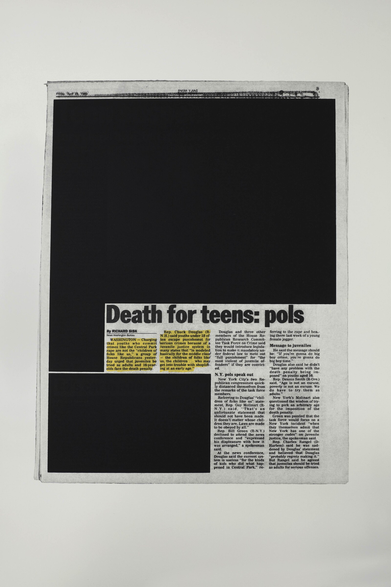 No one can accuse this show of shirking the issues of the day. Human Design (2019), Reparation Hardware, and Red Sourcebook (both 2018), a trio of videos by Ilana Harris-Babou, mix the languages of postcolonial theory, interior design, redlining, and ecotourism in a way that feels cathartic, if a little clever—for instance, trying to hammer nails with glazed ceramic tools in Reparation Hardware. Several pieces feature news cut from whole cloth: Alexandra Bell presents No Humans Involved: After Sylvia Wynter (2018–19), a row of prints of the New York Daily News tracing the public animalization of the Central Park Five (wrongly convicted of rape, exonerated in 2002). We know where this is going, and there it is—the rightmost panel: the infamous full-page ad calling for law and order, and for the death penalty for these teens, signed in Donald J. Trump’s hellmouth scrawl. There are also Josh Kline’s monochrome photographs framed in wild-hued metal and glass boxes filled with colored gels and water, a post-accelerationist wish list for sites like the Capitol Building (United States Capitol, Washington DC, 2019) and Front Desk, Twitter Headquarters, San Francisco (2019). Again and again, the show’s most intense political moments are also its most formally reserved.