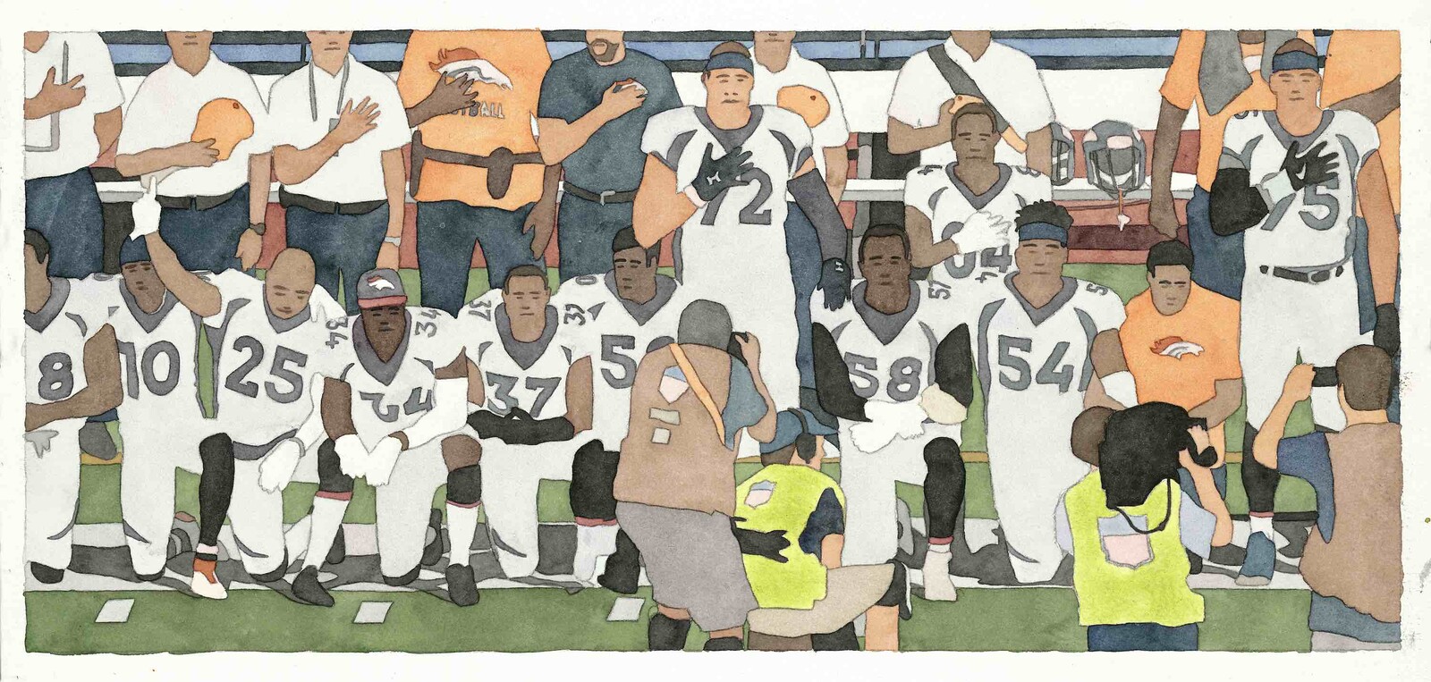 Indeed, at times the 2019 biennial can be downright soothing. In Ascent/Dissent (2019), by Marcus Fischer, pleasant, droning, spa-style harmonies fill the Whitney’s lower stairwell, which permanently features a Felix Gonzalez-Torres lightbulb sculpture from 1994, titled—what else—“Untitled” (America). The sounds, variations on a single chord, are placating, a respite from the crowds above and below, an interval in the show. It is exactly the kind of stripped-down performance that refuses, if not quite disputes, the hackneyed, swelling progressions that accompany Kota Ezawa’s warbling watercolor animation of the NFL anthem protests, National Anthem (2018): a chamber orchestra playing “The Star-Spangled Banner.”