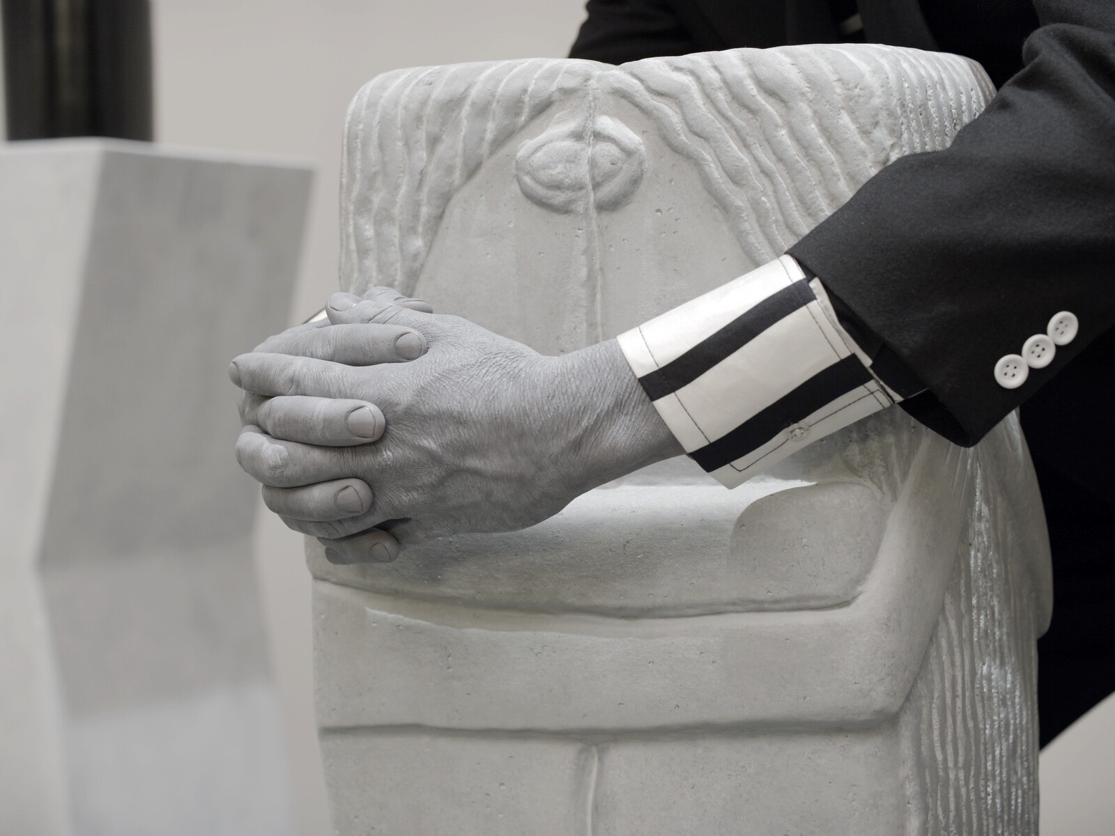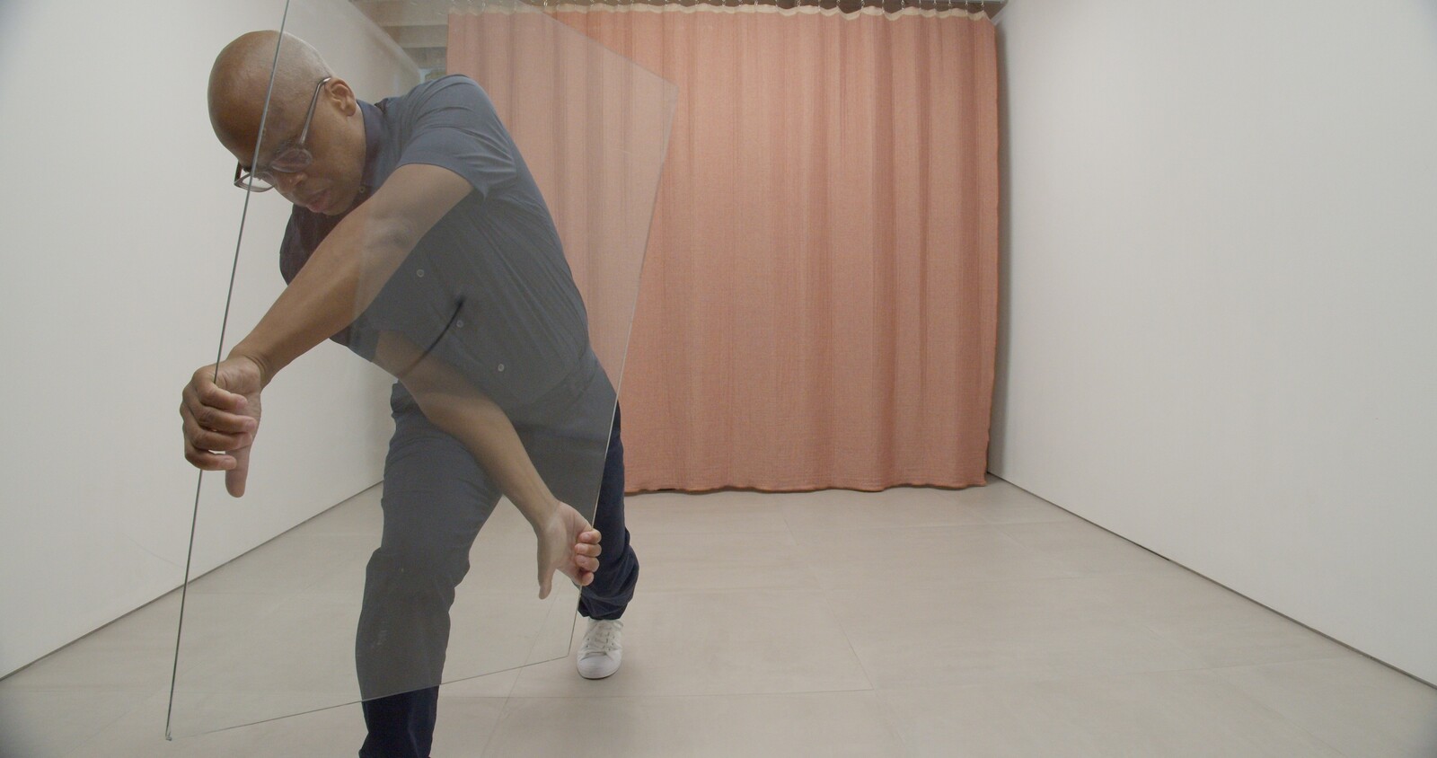 Several standout works explore theatricality as a form of shapeshifting. In ROY G BIV (2022), Alex Da Corte performs the parts of Marcel Duchamp, his female alter ego Rrose Sélavy, Batman’s The Joker, and one of the figures from Brancusi’s 1916 sculpture The Kiss. Over the course of the hour-long video, Da Corte embraces and rearranges historic sculptures housed in the Philadelphia Museum of Art, the black-and-white documentation of his mournful, uncanny performance gradually becoming saturated with color. The silent film, exhibited in a large cube that too will change color throughout the exhibition, is as intriguing as it is unnerving. In contrast to this lushness, Dave McKenzie turns his attention to the mundane objects in his studio, improvising a series of movement pieces in which he reconsiders his body’s basic relationship to the accessories that populate his space. Kandis Williams brings her background in dramaturgy to a repurposing of Arthur Miller’s 1949 Death of the Salesman in her Death of A (2022). Miller’s story of the crushing disappointments of the American Dream becomes part of a script that includes texts by Saidiya Hartman, Albert Einstein, and Yvonne Rainer, performed by a single actor on two of the four screens. A collage of historical, political, and popular images is projected on the other two. This new narrative captures the violence, psychical and psychological, endured by the Black body.