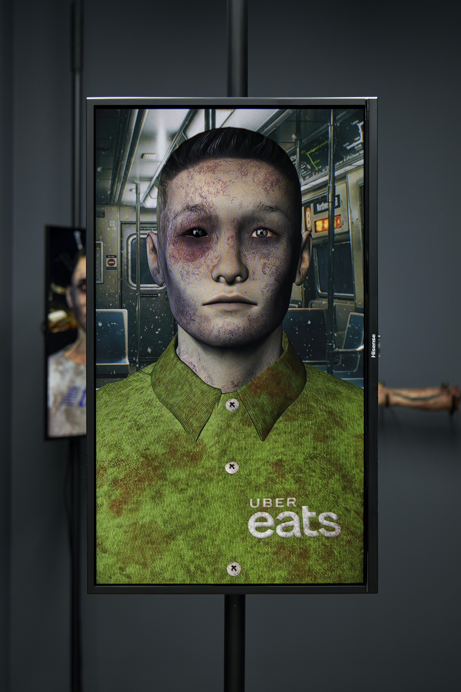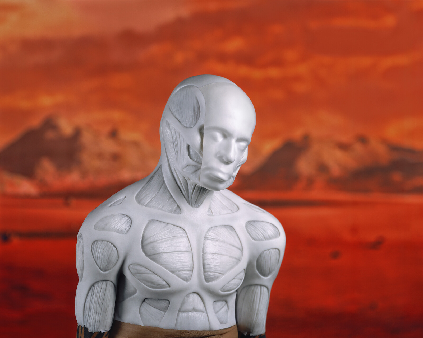 A recurring concern through the exhibition is a palpable disillusionment with the human: a number of works address the transformation and mutation of the individual into parallel personas. Low-budget branded zombies act as avatars for Andrew Roberts in La Horda [The horde] (2020), as brown bodies become increasingly disposable essential workers. The artist’s transformation is shaped by his childhood memories, an amalgamation of American entertainment culture and the escalating violence of daily life in Tijuana. Daniel Joseph Martinez’s photographs document his metamorphosis into five fictional characters—Mary Shelley’s monster, Count Dracula, the engineer in the film Prometheus (2012), an alien from The X-Files (1993–2002), and the Drone Host from Westworld (2016–ongoing)—each teetering between the human and non-human. These alien species are starkly framed against a bright yet blurred landscape, at once familiar and estranged.