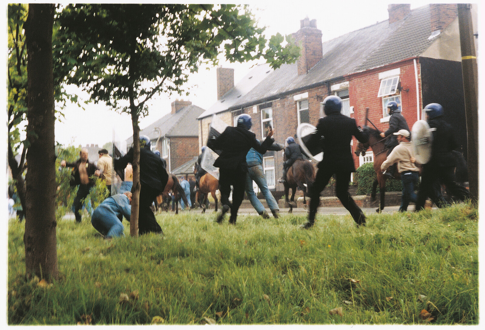 The curators boldly repeat the combination in reverse at the far end of the space, while placing Jeremy Deller’s The Battle of Orgreave (2001) smack in-between. This reenactment of a 1984 fight between the police and striking miners (with roles played by veterans of the original confrontation) challenges Margaret Thatcher’s credo that “there is no such thing as society” by celebrating solidarity and resistance through swagger and grim humor. The curators delve deeper into the history of protest and workers’ struggle with a mini-retrospective of Taeko Tomiyama (1921–2021), whose 1946 painting Ruins transfigured the destruction of Japanese cities in World War II into the chilling sublime of ancient temples. Later she channeled the shock of the Fukushima nuclear disaster into sardonic paintings in which demons dance over a blood-red sky (Crisis: Prayer for the Sea and Sky, 2012) or ride a pink cloud (Fukushima: Spring of Caesium-137, 2011).