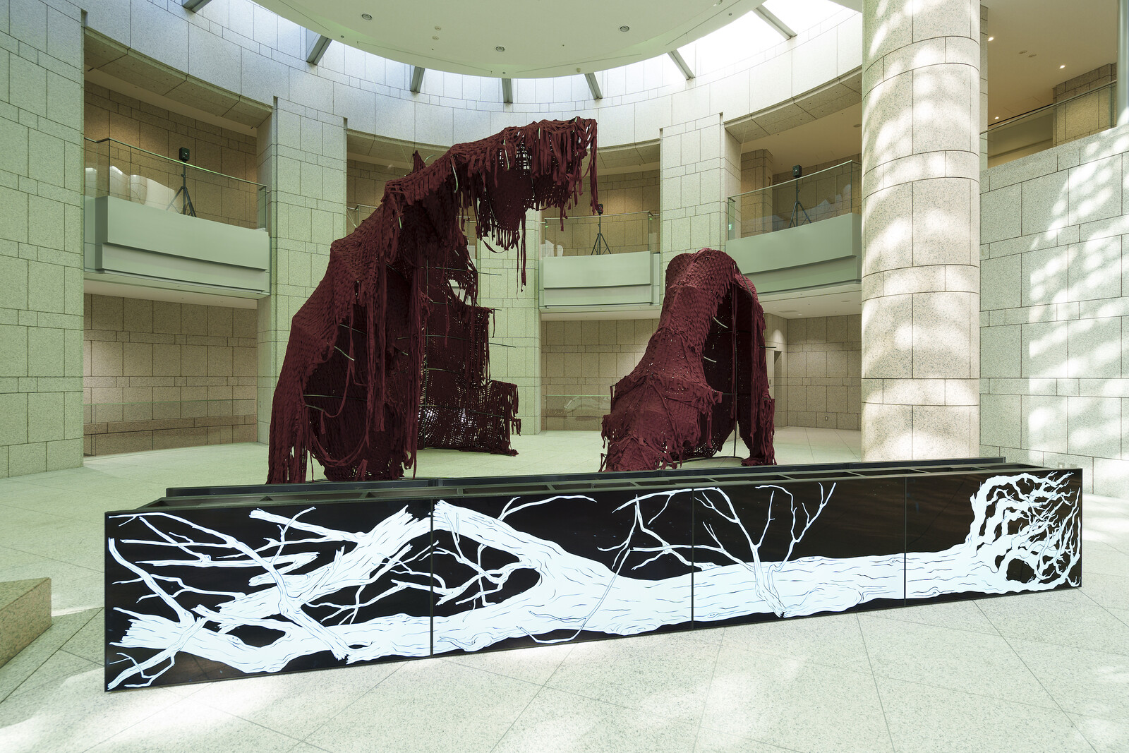 It’s fortunate that this year’s Triennale has coincided with the reopening of Kenzō Tange’s refurbished Museum of Art, its postmodernist spirit measured by his trademark modularity. The grand entrance gallery is an architectural gem: as you enter at its transverse middle, a series of tiered platforms rises gently to the left and right, spanned by a gabled glass roof with adjustable light slats. The curators of this edition, Carol Yinghua Lu and Liu Ding, have turned this theatrical space into the multi-sensory set of a dystopian scenario. Hovering overhead are three skeletal metal frameworks covered in crisscross vermilion textile strips, like the shed shells of giant beetles. Two similar maroon-colored structures, also conceived by Sandra Mujinga (Unearthed Leaves, 2024), ascend across from the entrance, as if two Godzilla-like creatures had embraced in a deadly showdown before being turned into shadowy ghosts by a great disaster.
